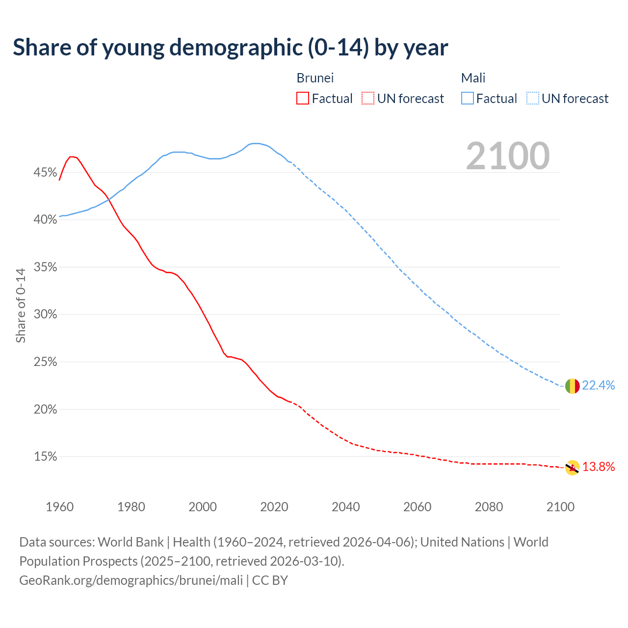 - The share of young demographic (0-15 years old) in Brunei is 20.8% vs 46.1% in Mali.