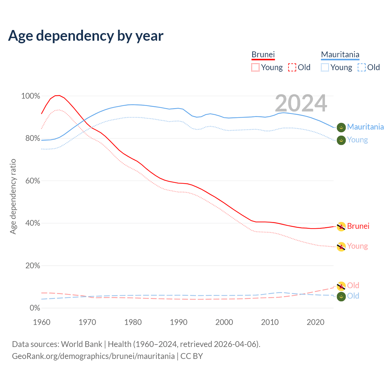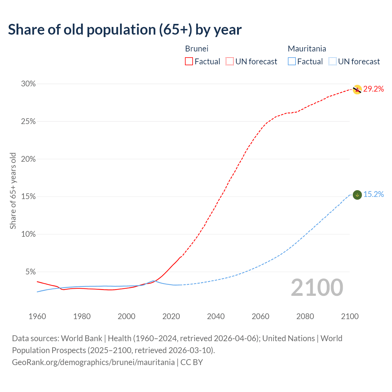 - The share of old-age demographic (65+) in Brunei is 6.87% vs 3.23% in Mauritania.