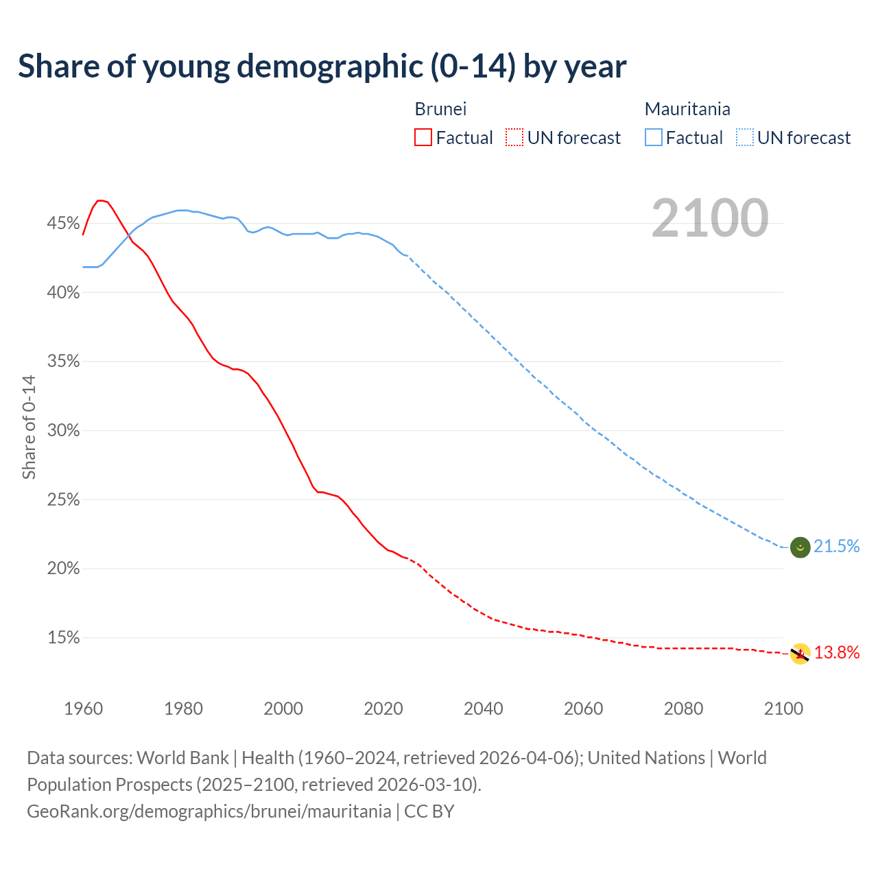 - The share of young demographic (0-15 years old) in Brunei is 20.8% vs 42.7% in Mauritania.