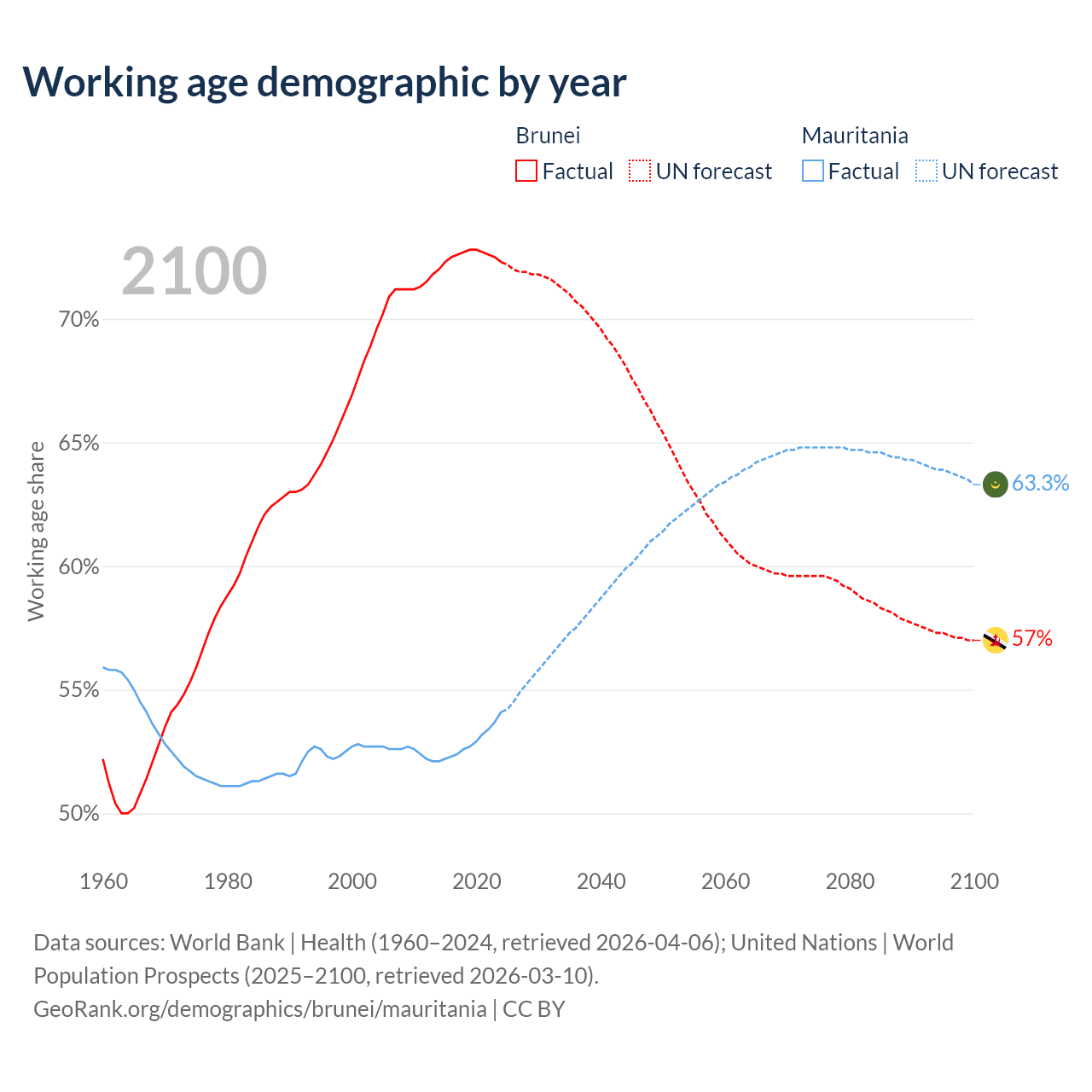 - Brunei has 340K working age adults (aged 15-64) vs 2.98M in Mauritania.