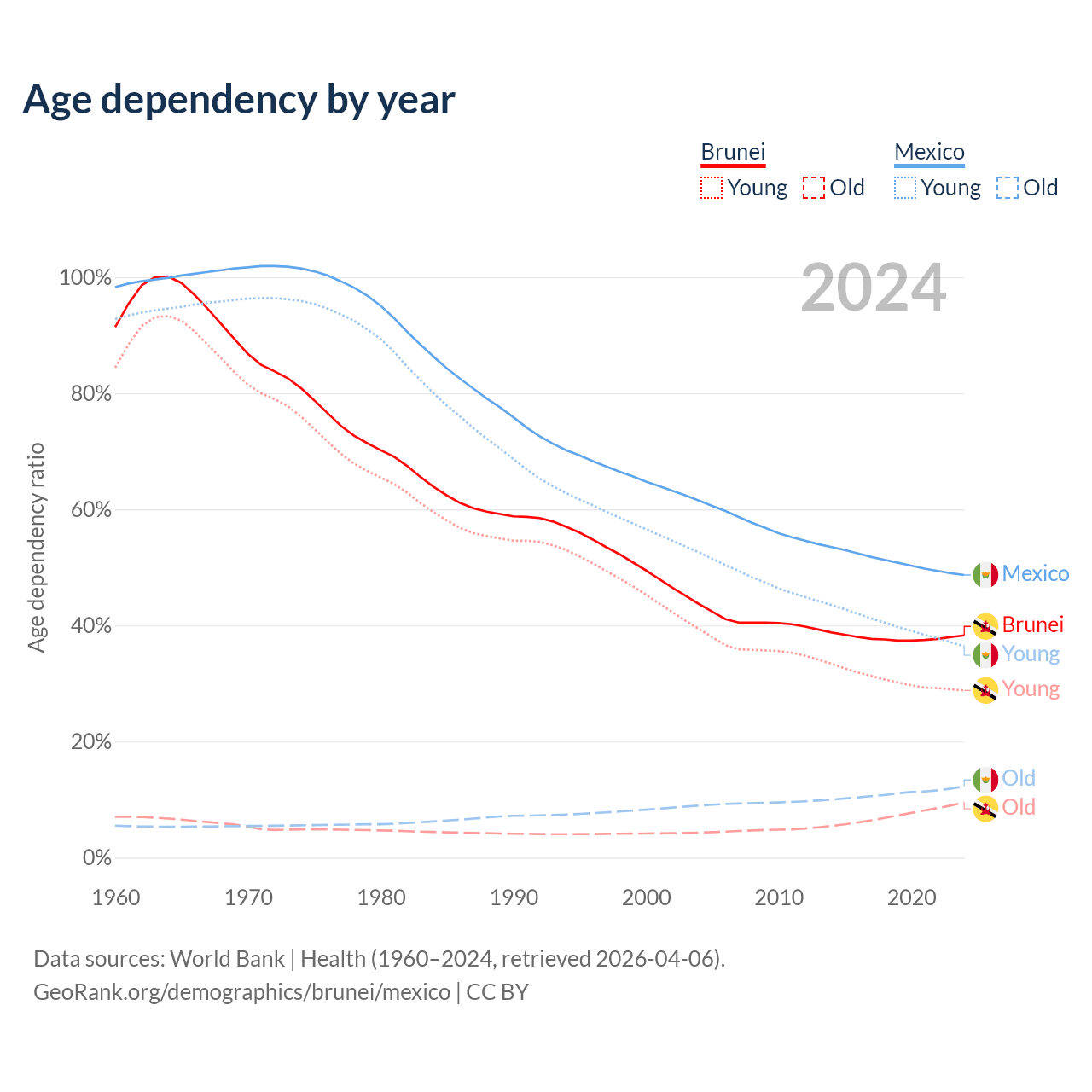 - Brunei is ranked 88/196 by median age (oldest to youngest) vs 102/196 for Mexico.