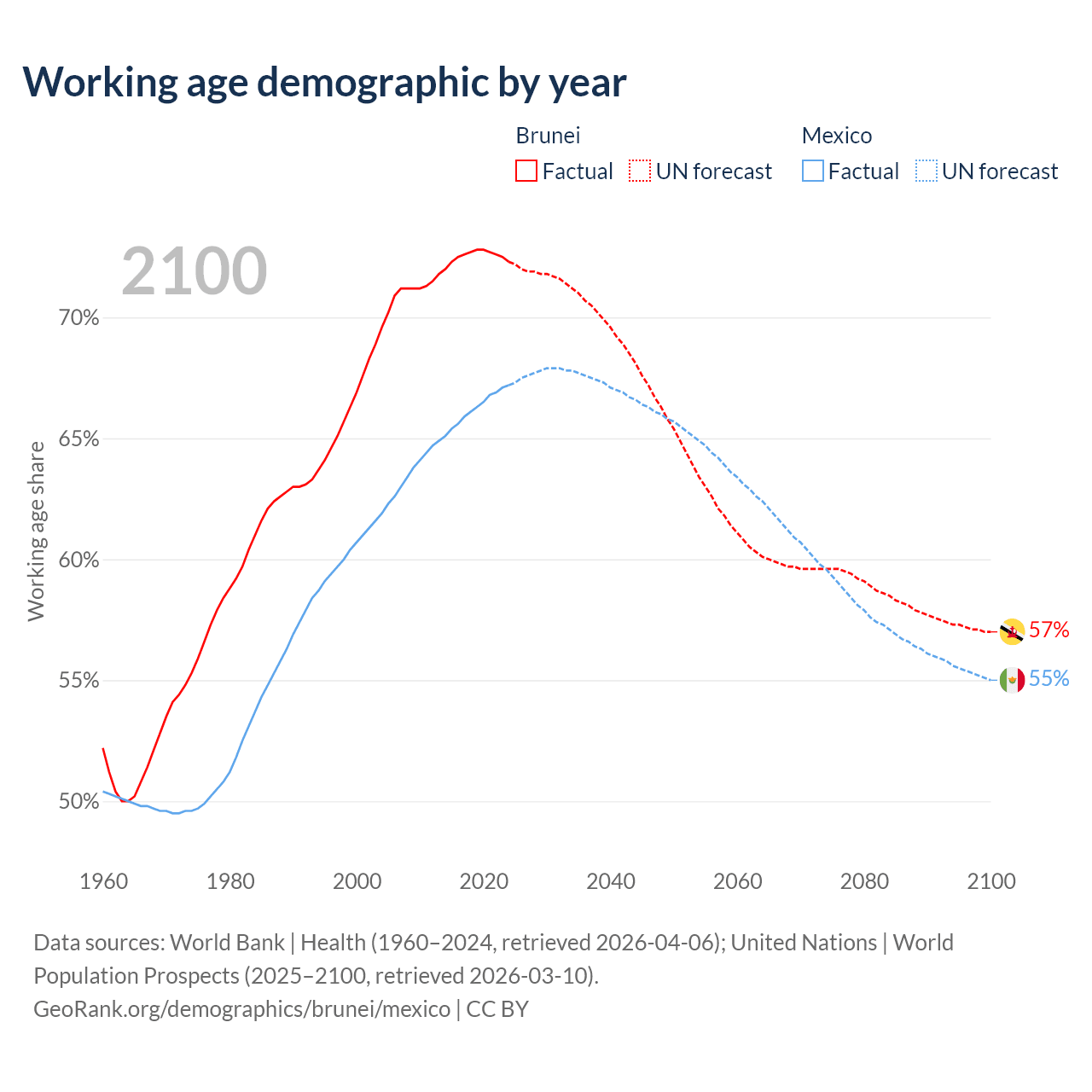 Median age Brunei vs Mexico, 1960-2100