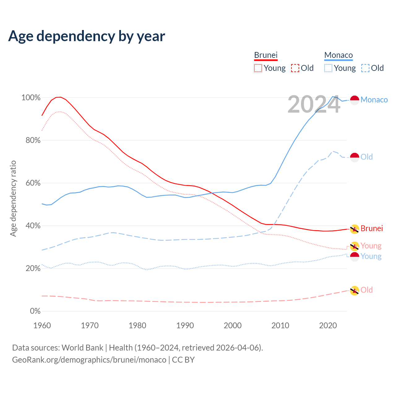 - Brunei is ranked 88/196 by median age (oldest to youngest) vs 1/196 for Monaco.