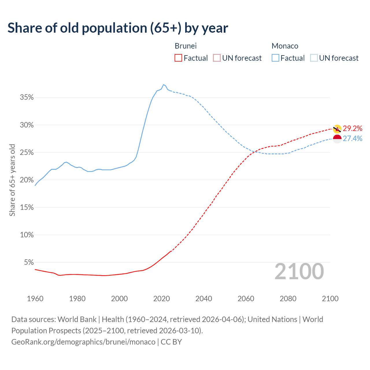 The share of older people aged 65 and over is 6.87% in Brunei and 36.2% in Monaco. Life expectancy in Brunei compared to Monaco .