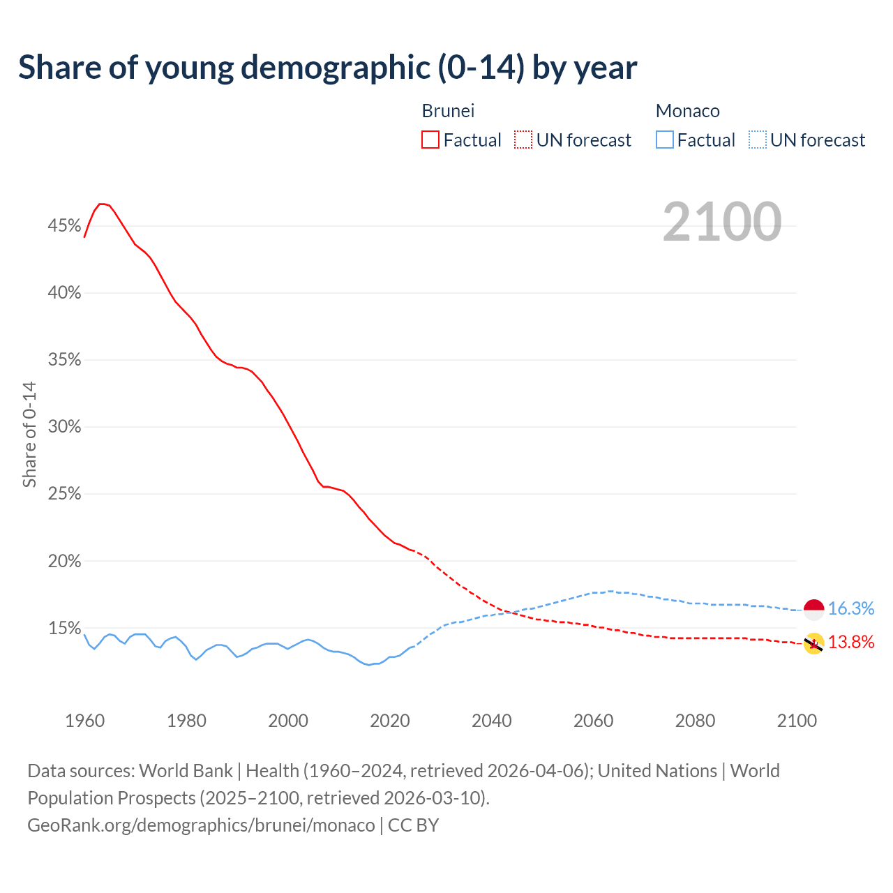 - The share of young demographic (0-15 years old) in Brunei is 20.8% vs 13.5% in Monaco.