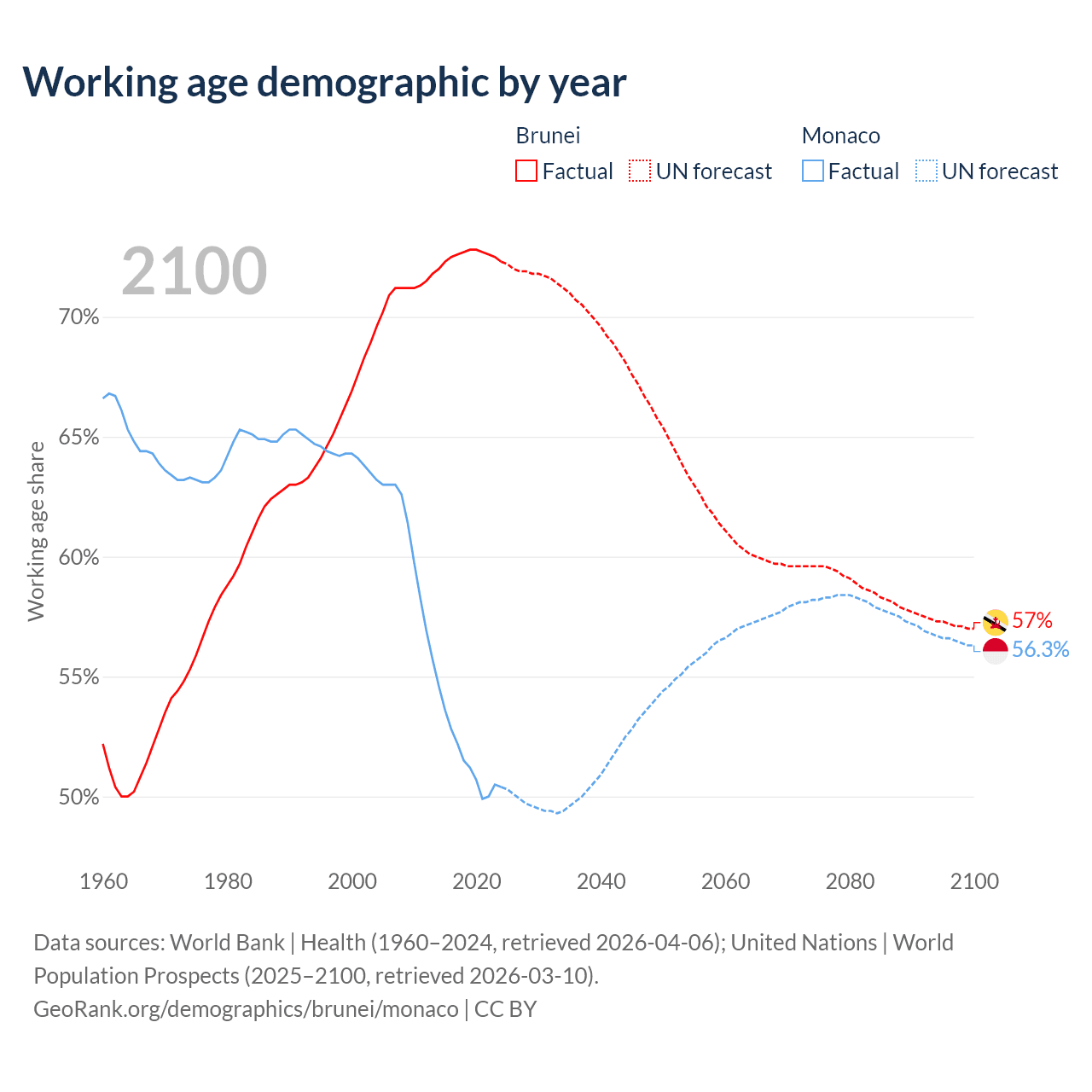 - Brunei has 340K working age adults (aged 15-64) vs 19.2K in Monaco.