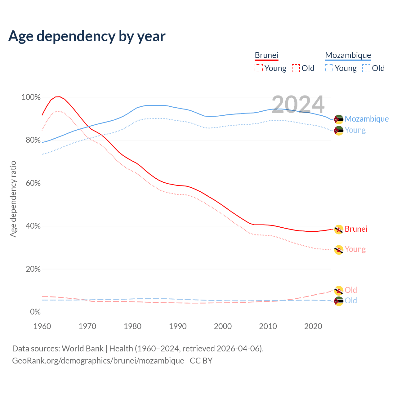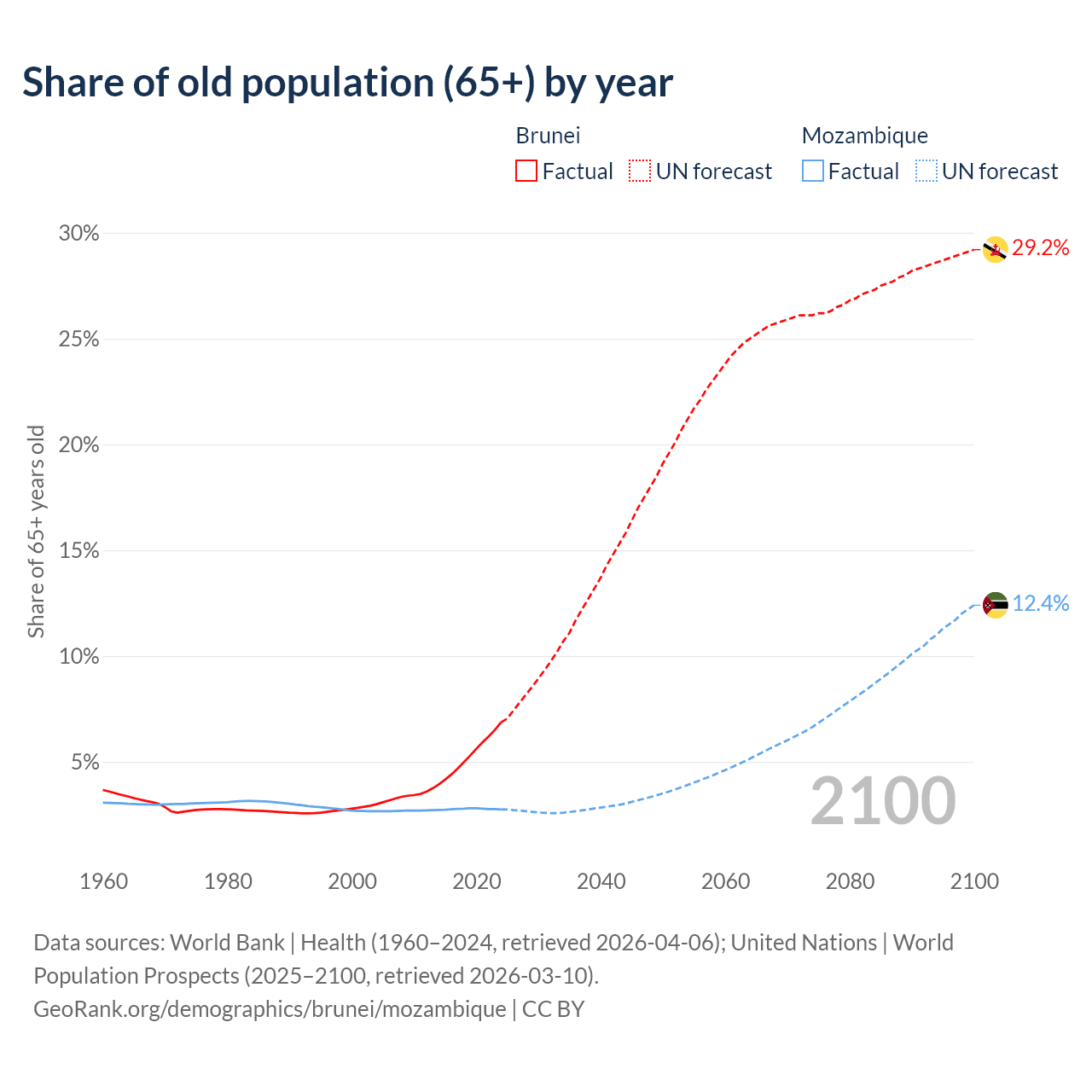 - The share of old-age demographic (65+) in Brunei is 6.87% vs 2.75% in Mozambique.