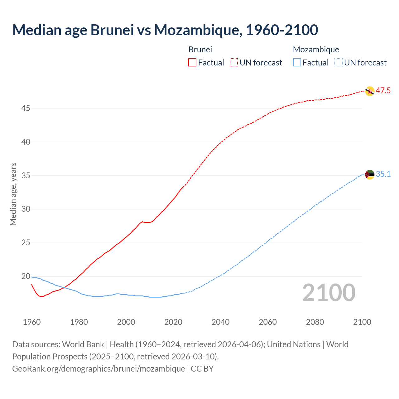 - Brunei is ranked 88/196 by median age (oldest to youngest) vs 189/196 for Mozambique.