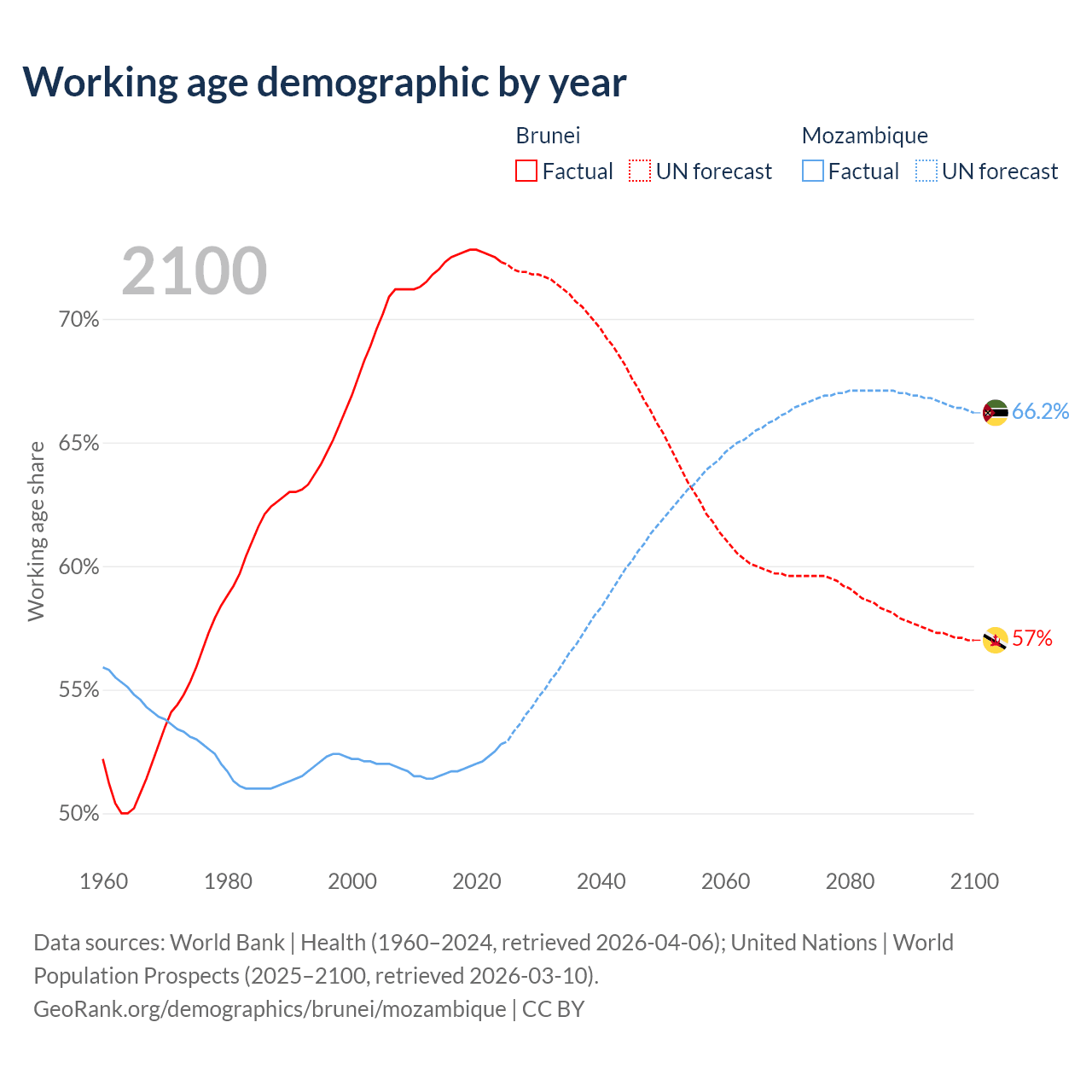 - Brunei has 340K working age adults (aged 15-64) vs 19.5M in Mozambique.