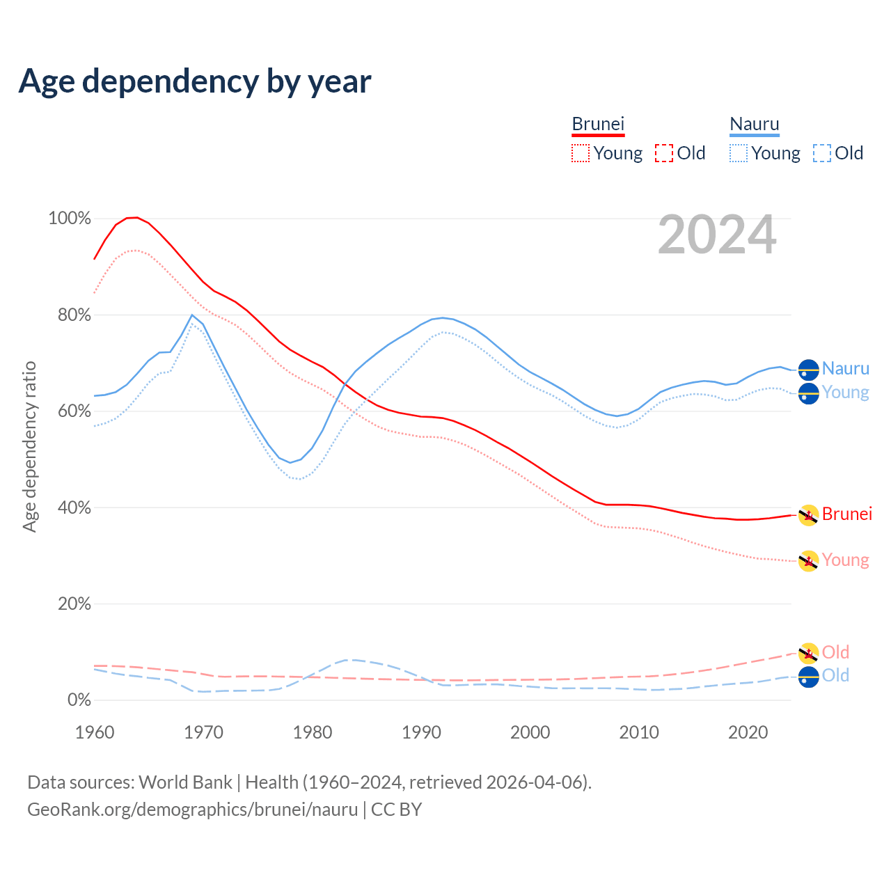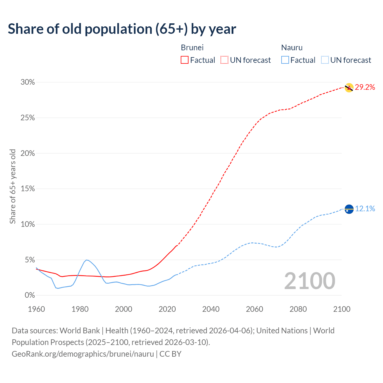- The share of old-age demographic (65+) in Brunei is 6.87% vs 2.85% in Nauru.
