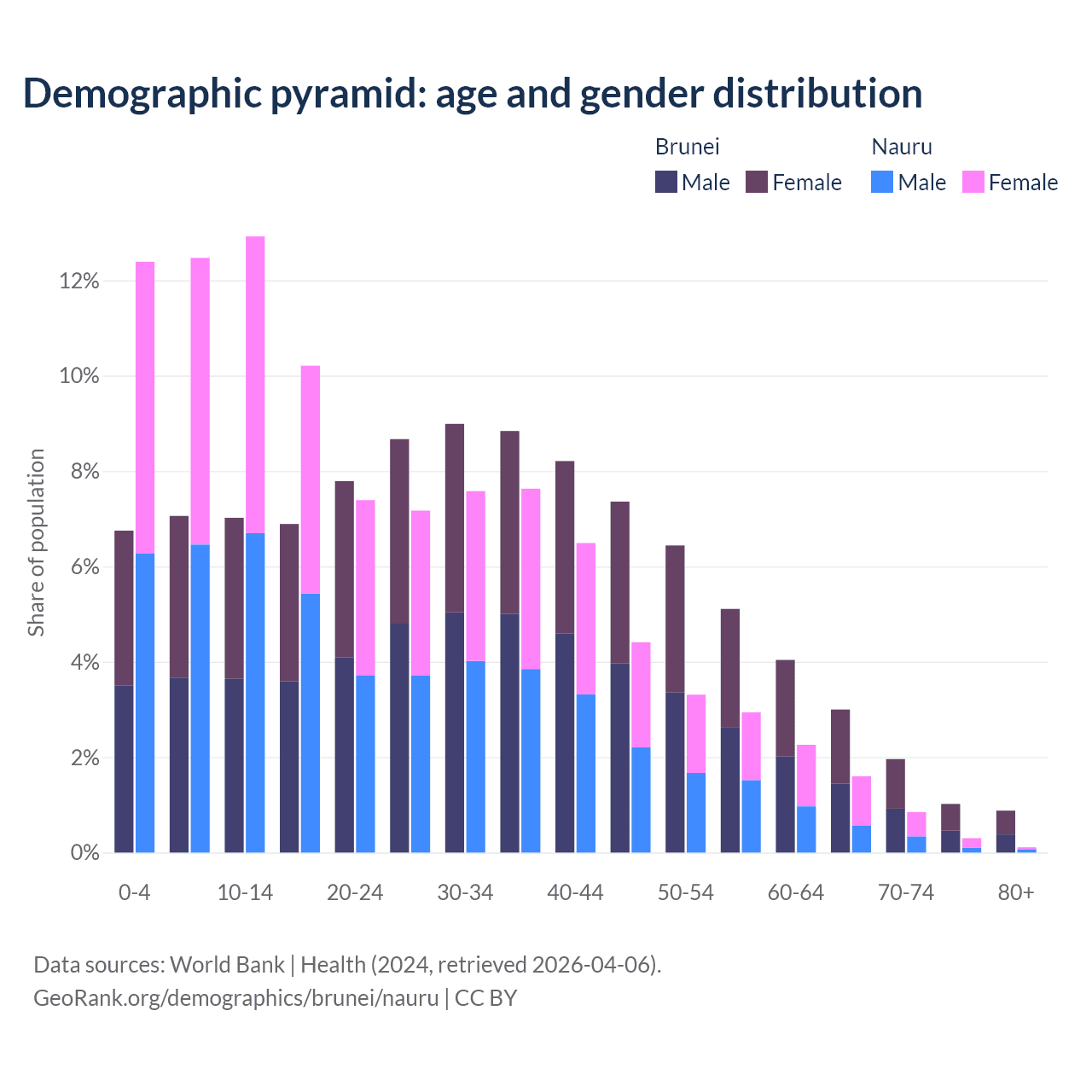 - As of 2026, the population of Brunei is 471K vs 12.1K in Nauru - 38.8 times difference.
