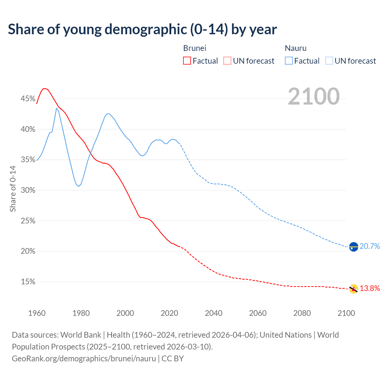- The share of young demographic (0-15 years old) in Brunei is 20.8% vs 37.8% in Nauru.