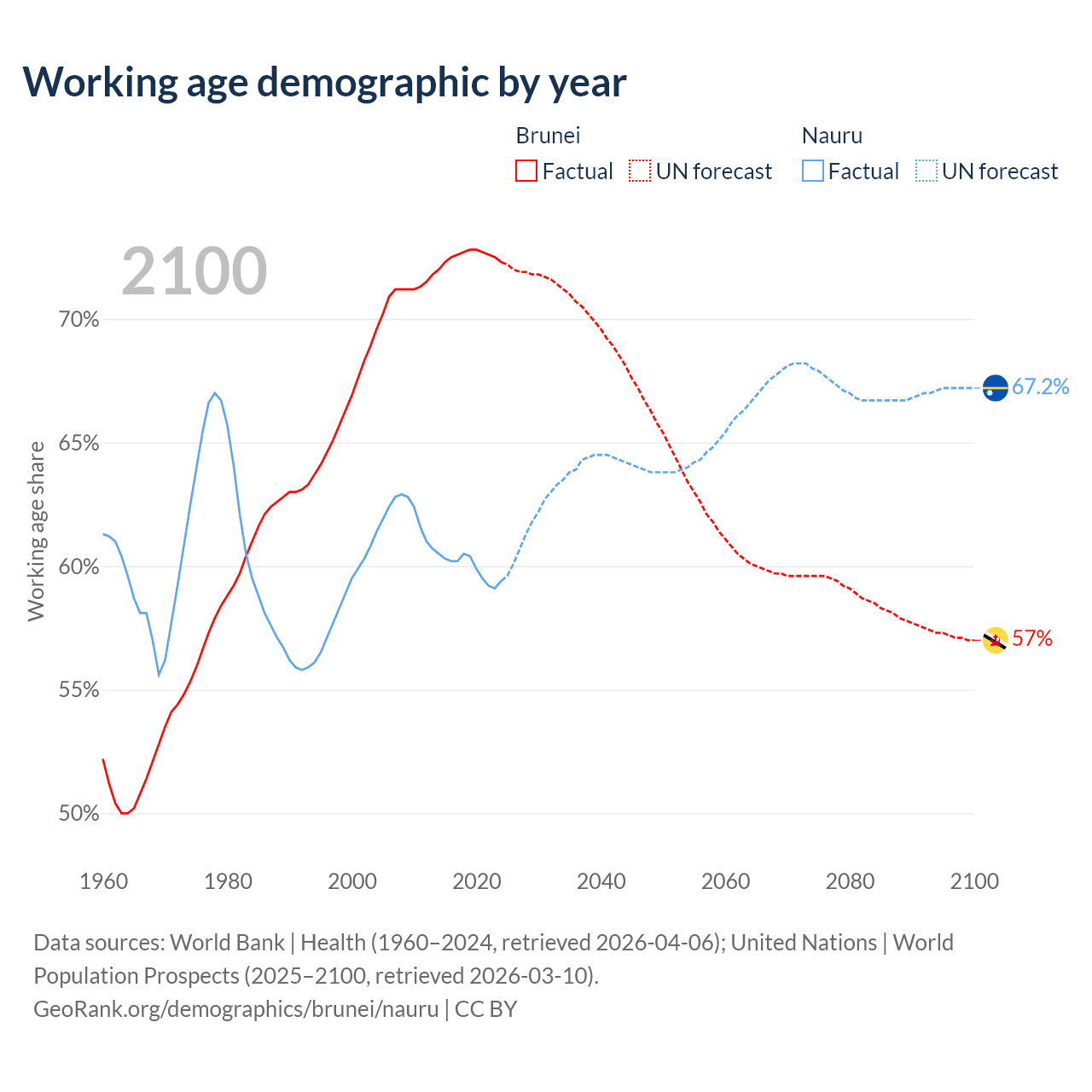 - Brunei has 340K working age adults (aged 15-64) vs 7.2K in Nauru.