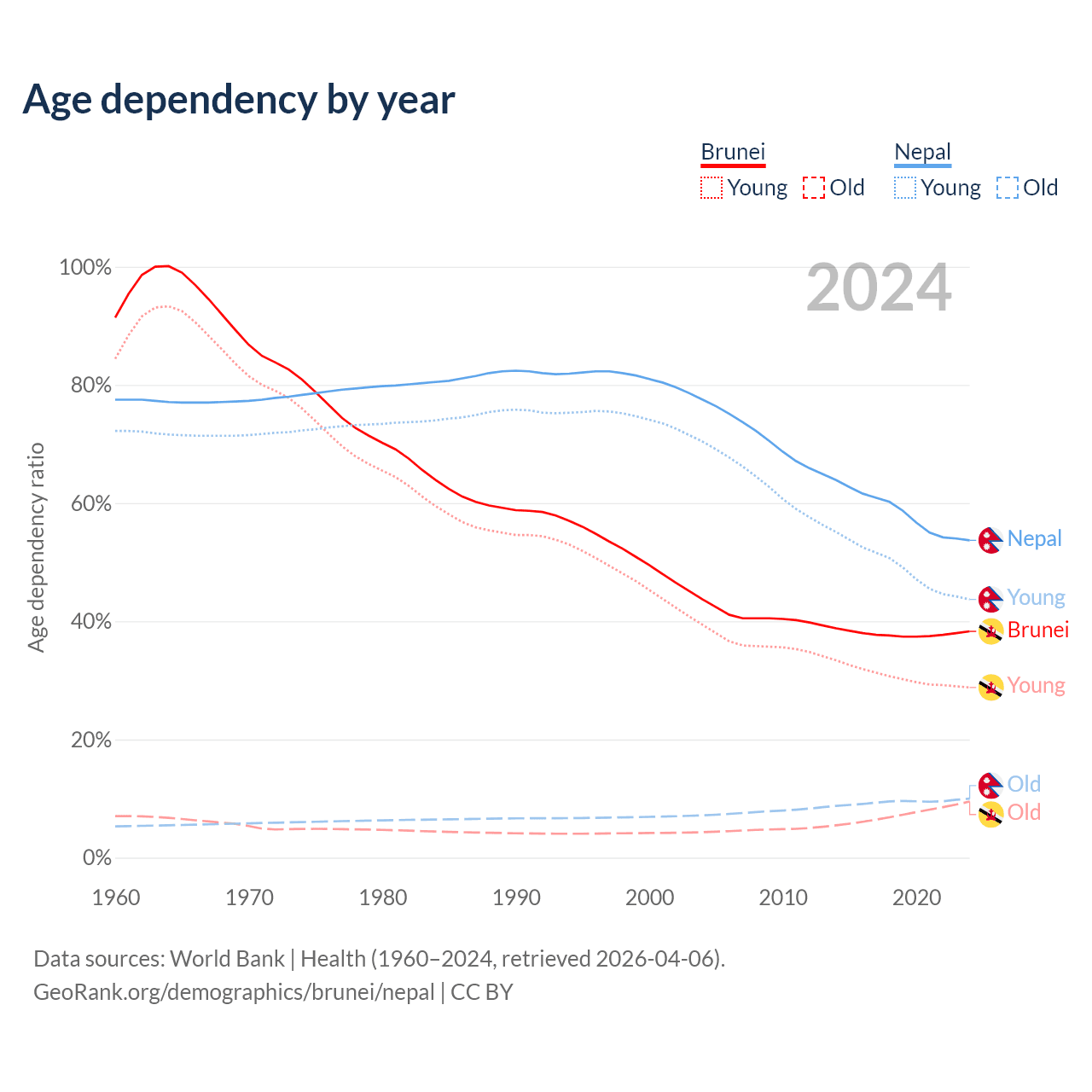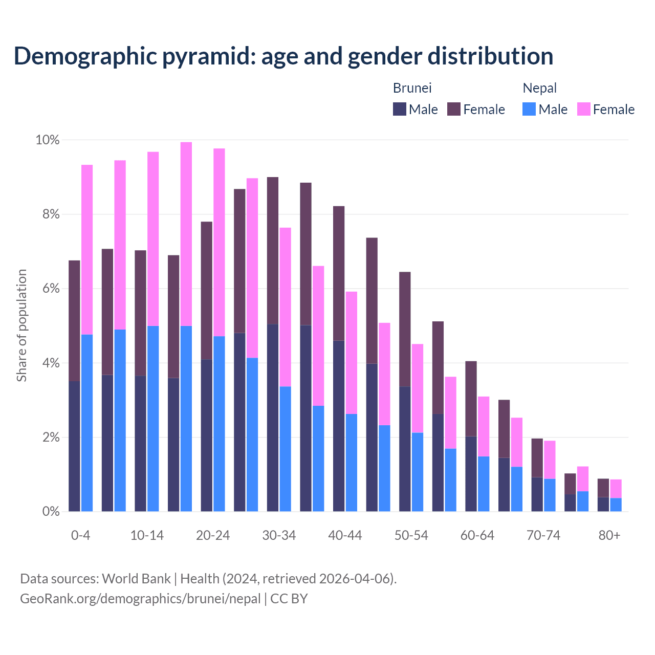 - Brunei is ranked 88/196 by median age (oldest to youngest) vs 127/196 for Nepal.
