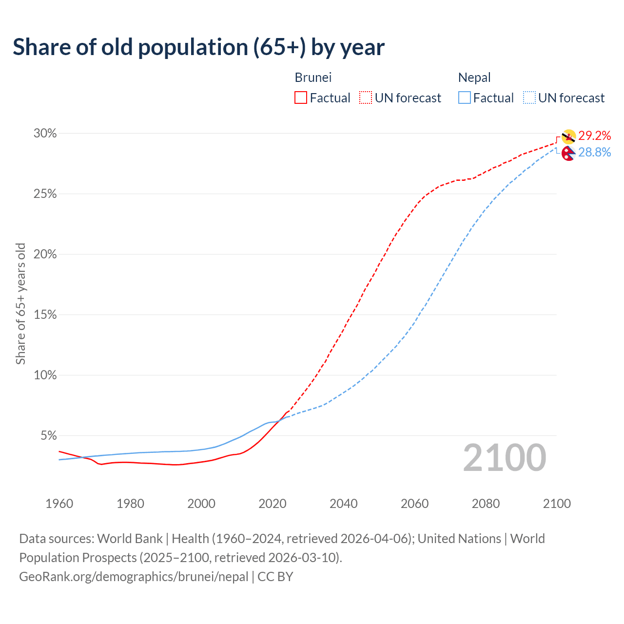 - The share of old-age demographic (65+) in Brunei is 6.87% vs 6.5% in Nepal.
