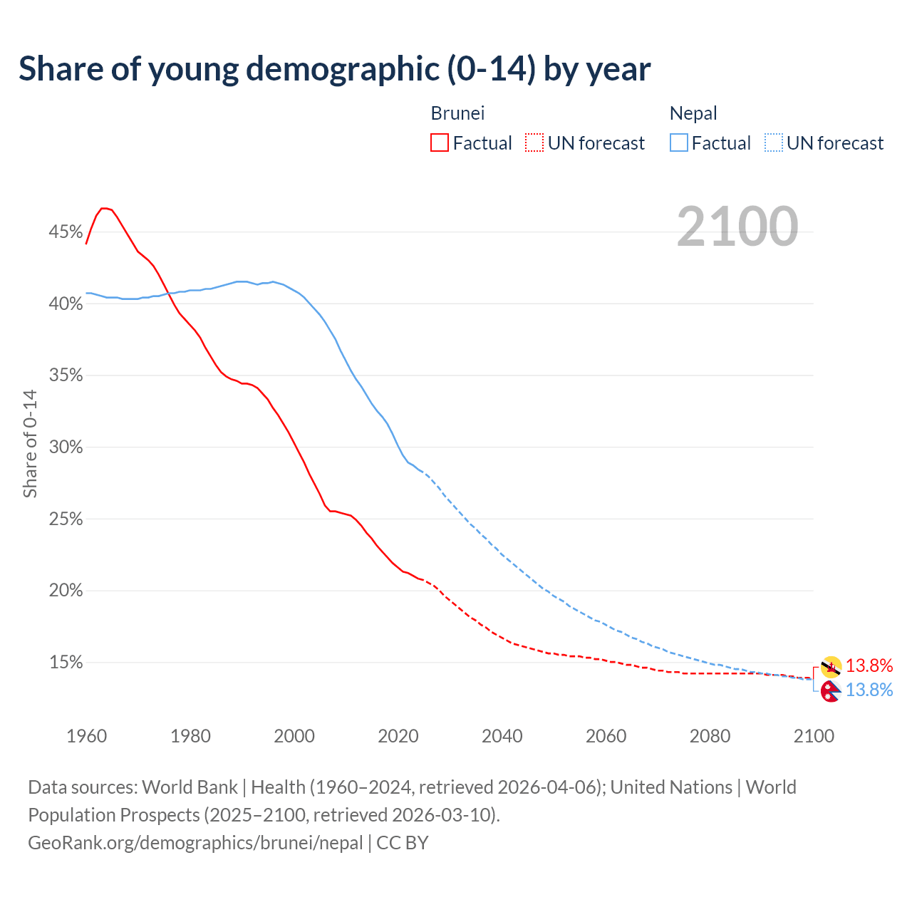 - The share of young demographic (0-15 years old) in Brunei is 20.8% vs 28.4% in Nepal.