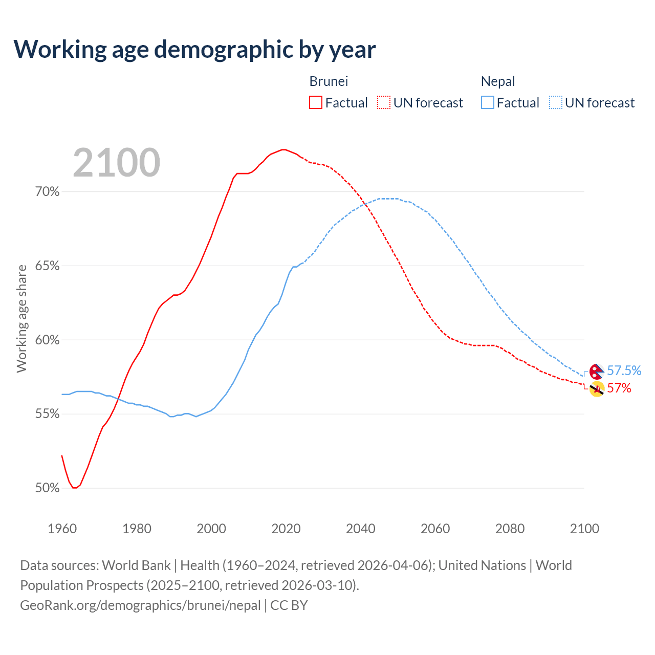 - Brunei has 340K working age adults (aged 15-64) vs 19.3M in Nepal.