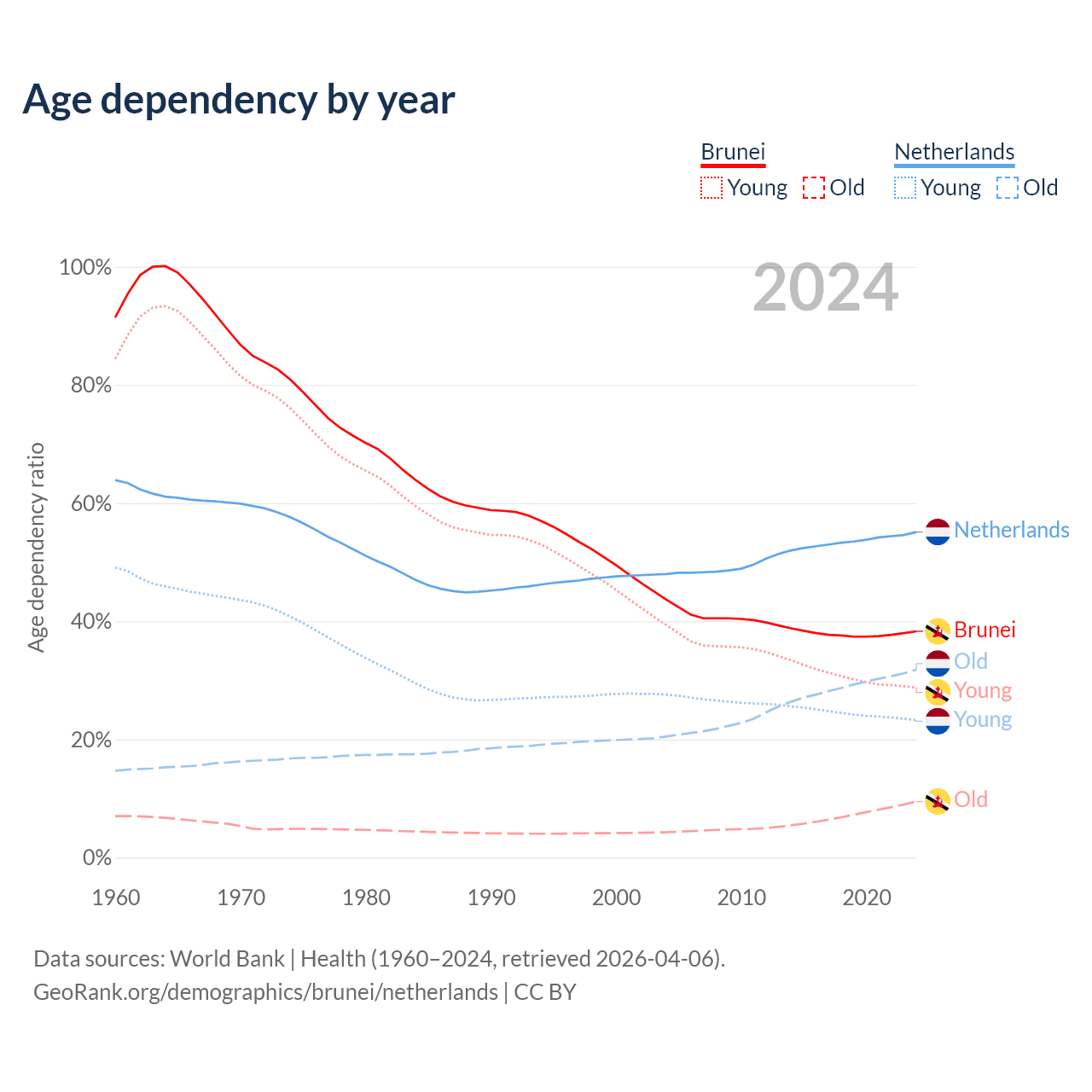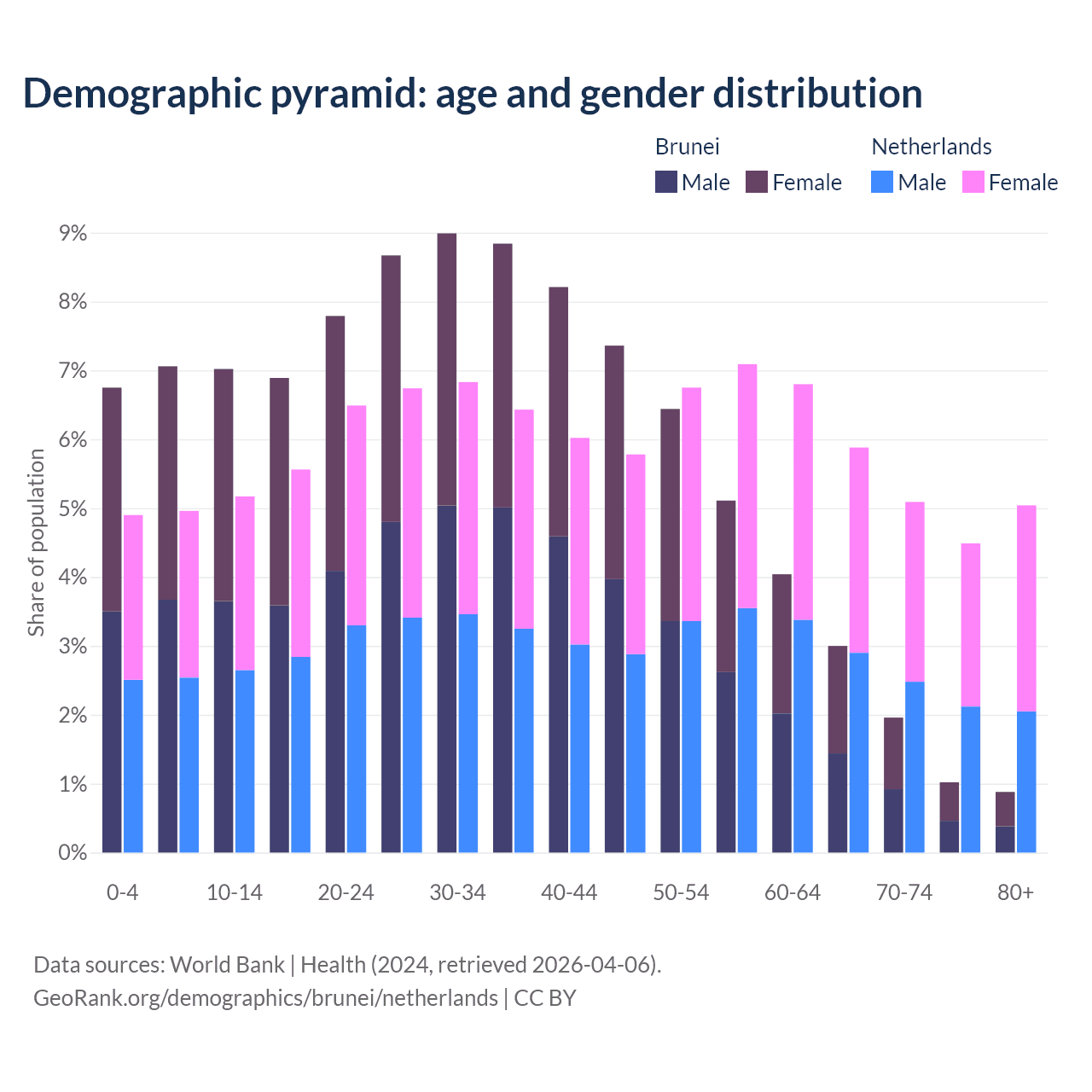 - Brunei is ranked 88/196 by median age (oldest to youngest) vs 33/196 for the Netherlands.