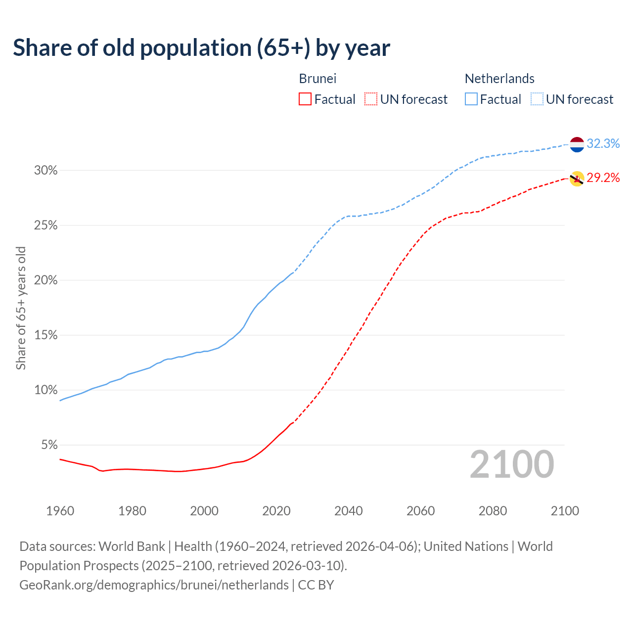 - The share of old-age demographic (65+) in Brunei is 6.87% vs 20.5% in the Netherlands.