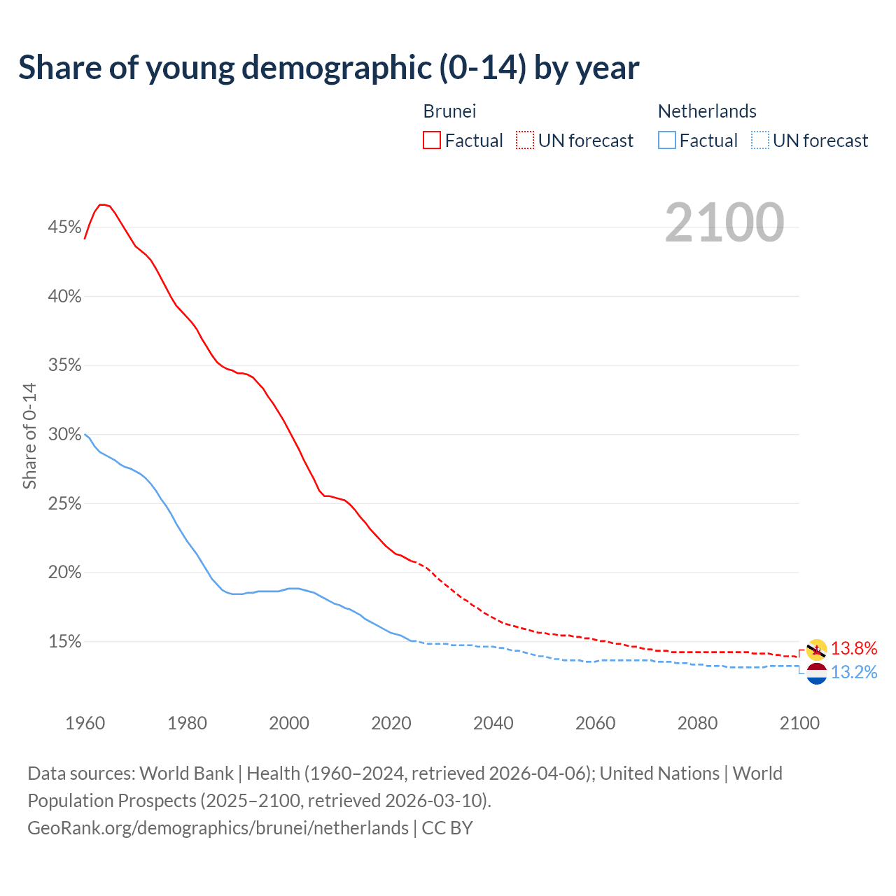 - The share of young demographic (0-15 years old) in Brunei is 20.8% vs 15% in the Netherlands.