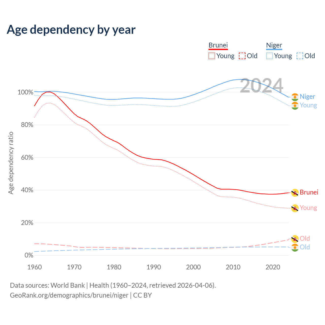 - The share of old-age demographic (65+) in Brunei is 6.87% vs 2.59% in Niger.