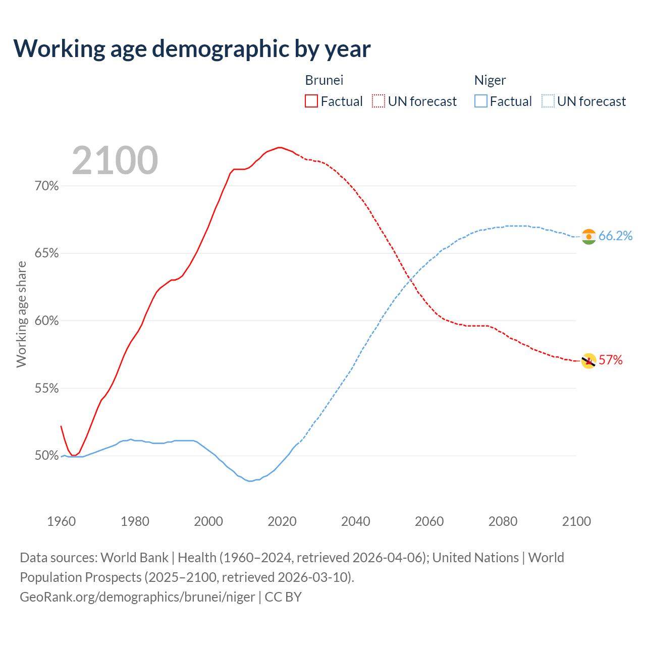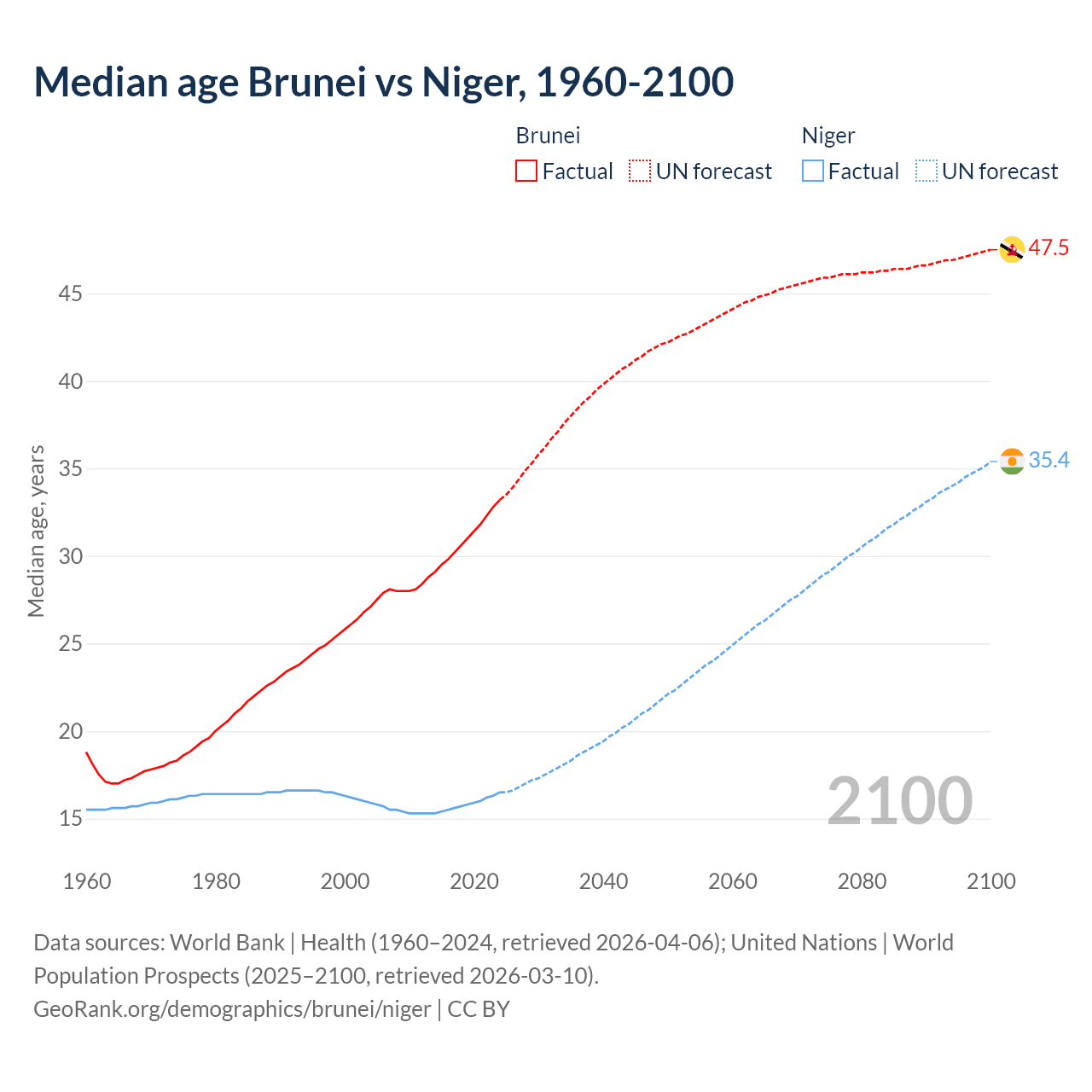 Median age Brunei vs Niger, 1960-2100