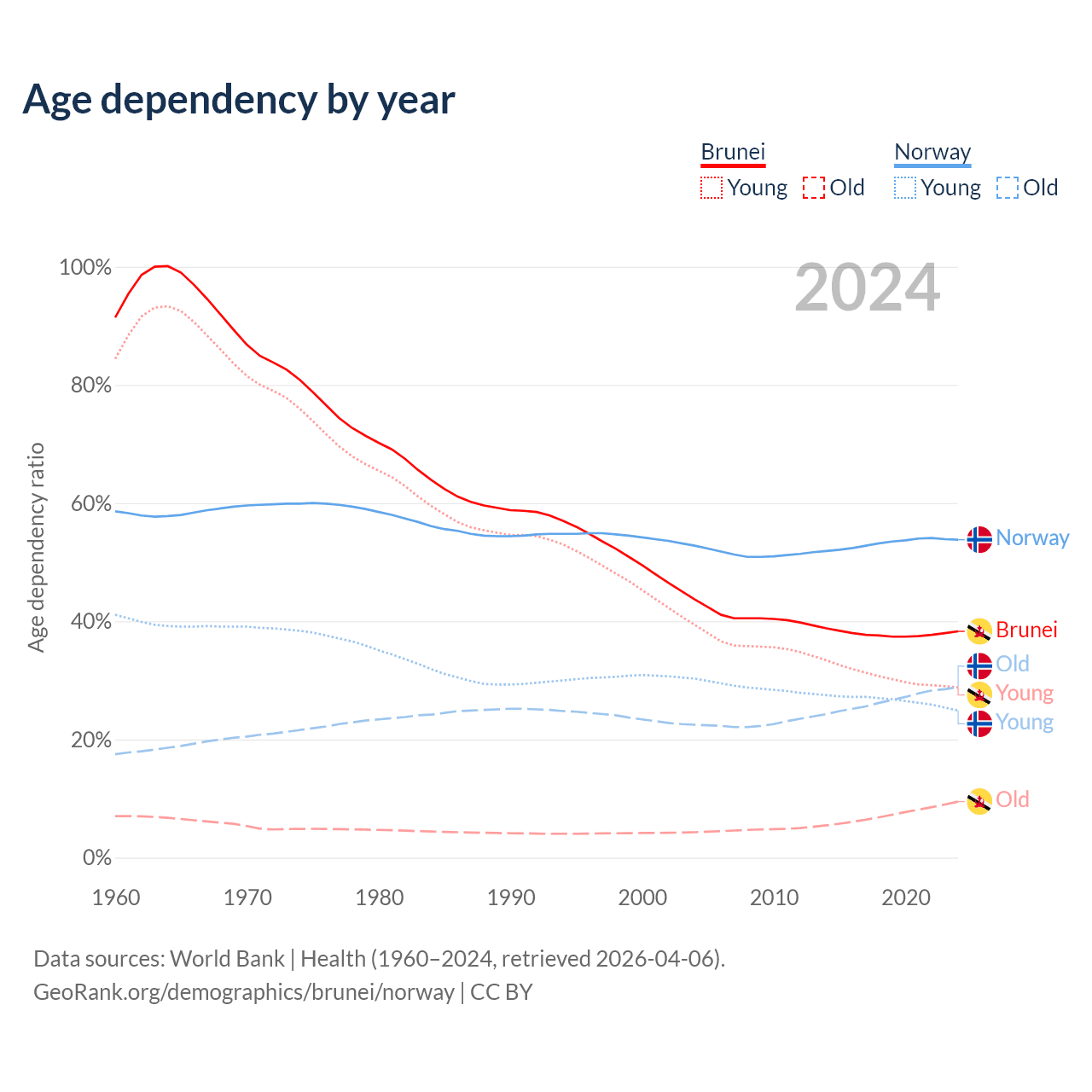 - The share of old-age demographic (65+) in Brunei is 6.87% vs 18.8% in Norway.