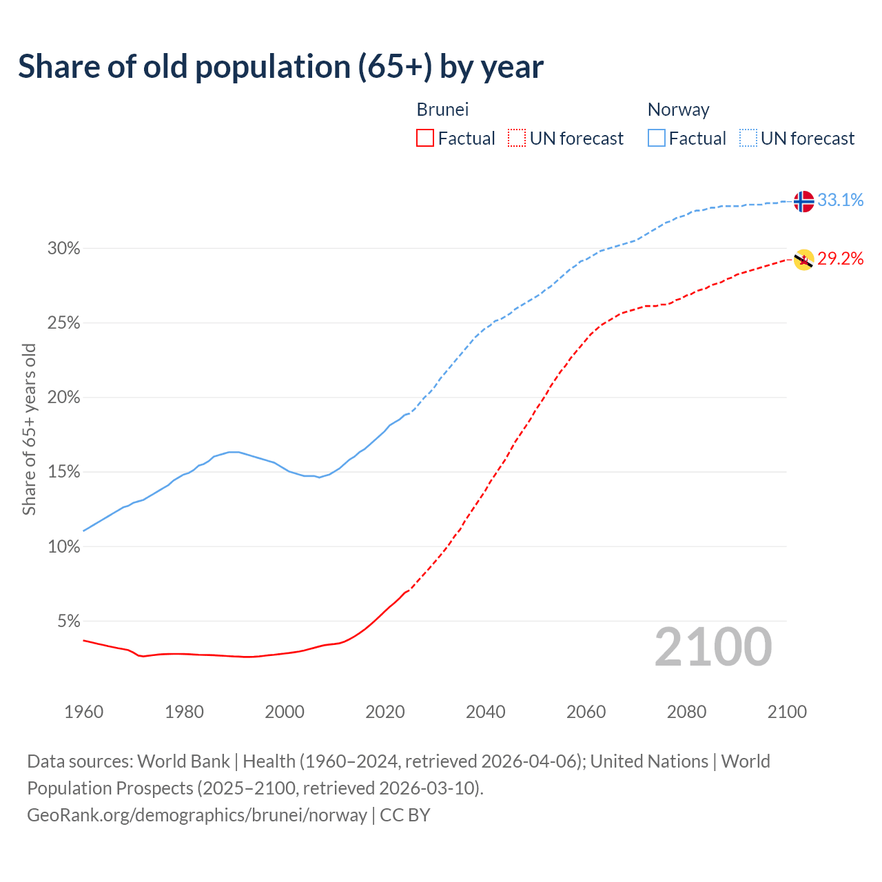 The share of older people aged 65 and over is 6.87% in Brunei and 18.8% in Norway. Life expectancy in Brunei compared to Norway .