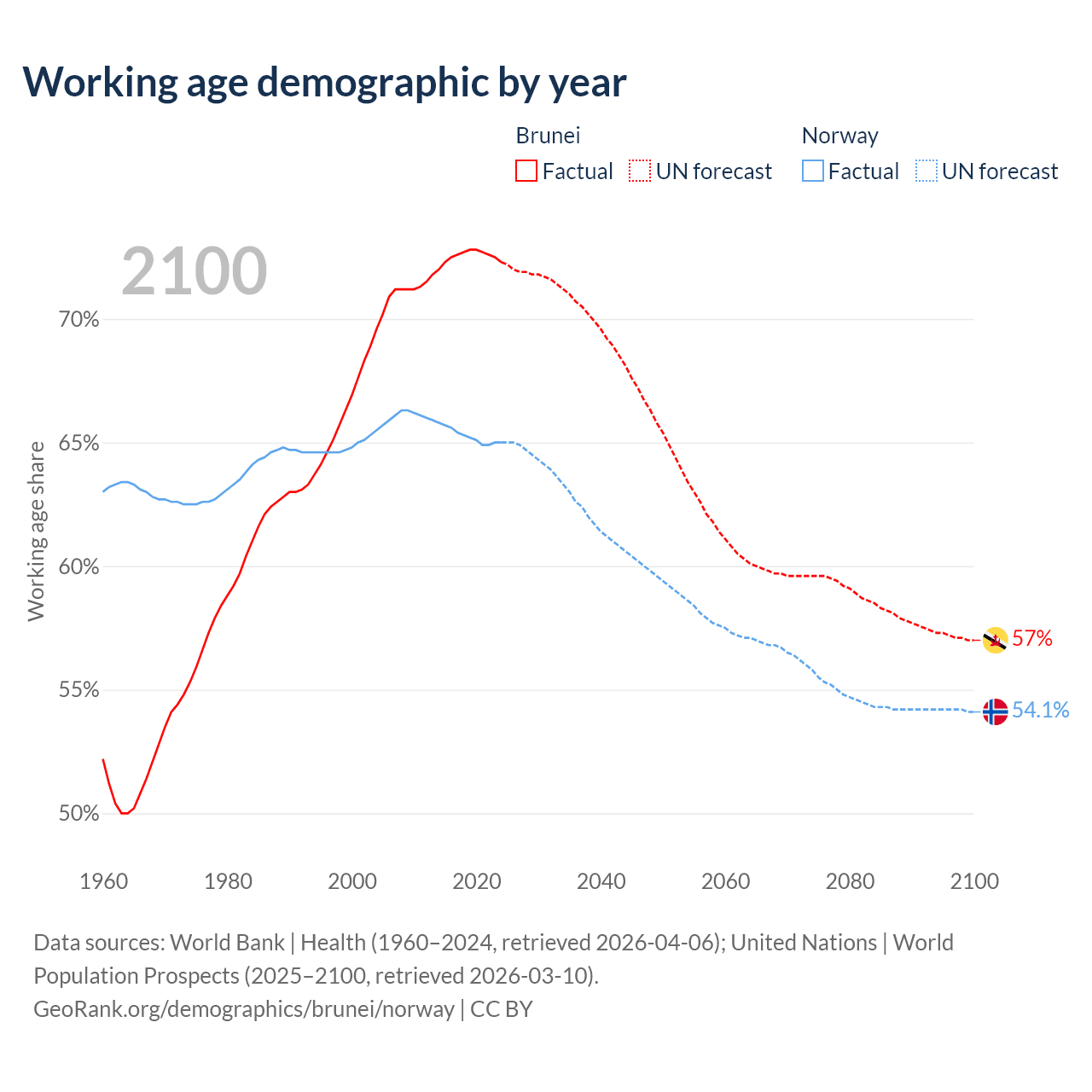 Median age Brunei vs Norway, 1960-2100