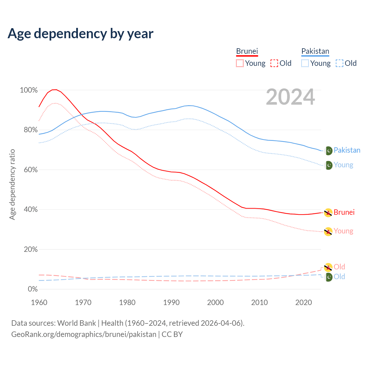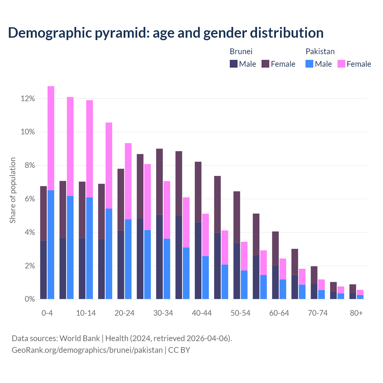 - The share of old-age demographic (65+) in Brunei is 6.87% vs 4.28% in Pakistan.
