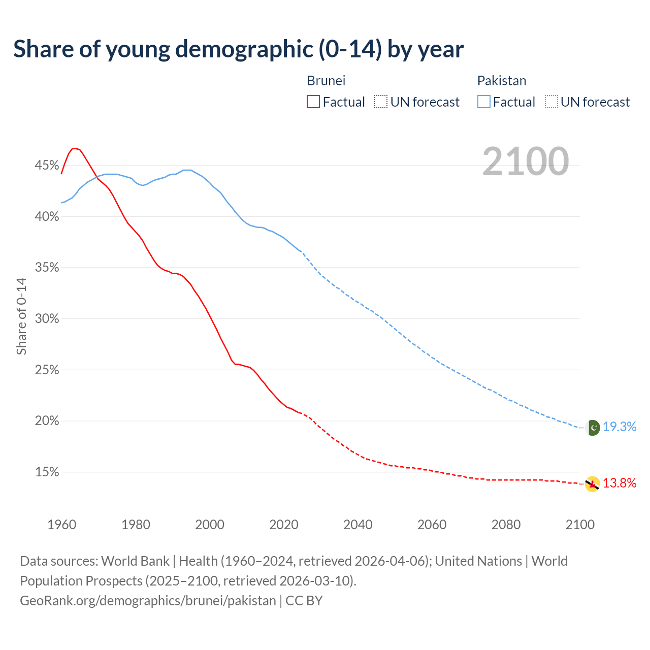 Median age Brunei vs Pakistan, 1960-2100