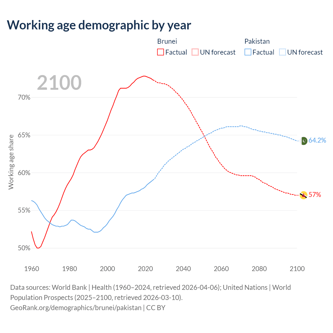 The share of older people aged 65 and over is 6.87% in Brunei and 4.28% in Pakistan. Life expectancy in Brunei compared to Pakistan .