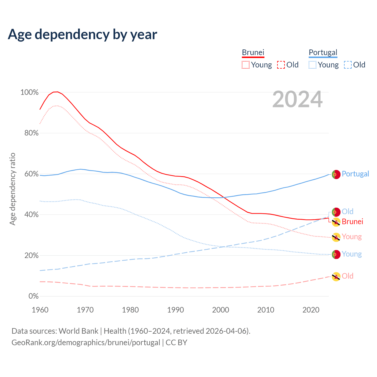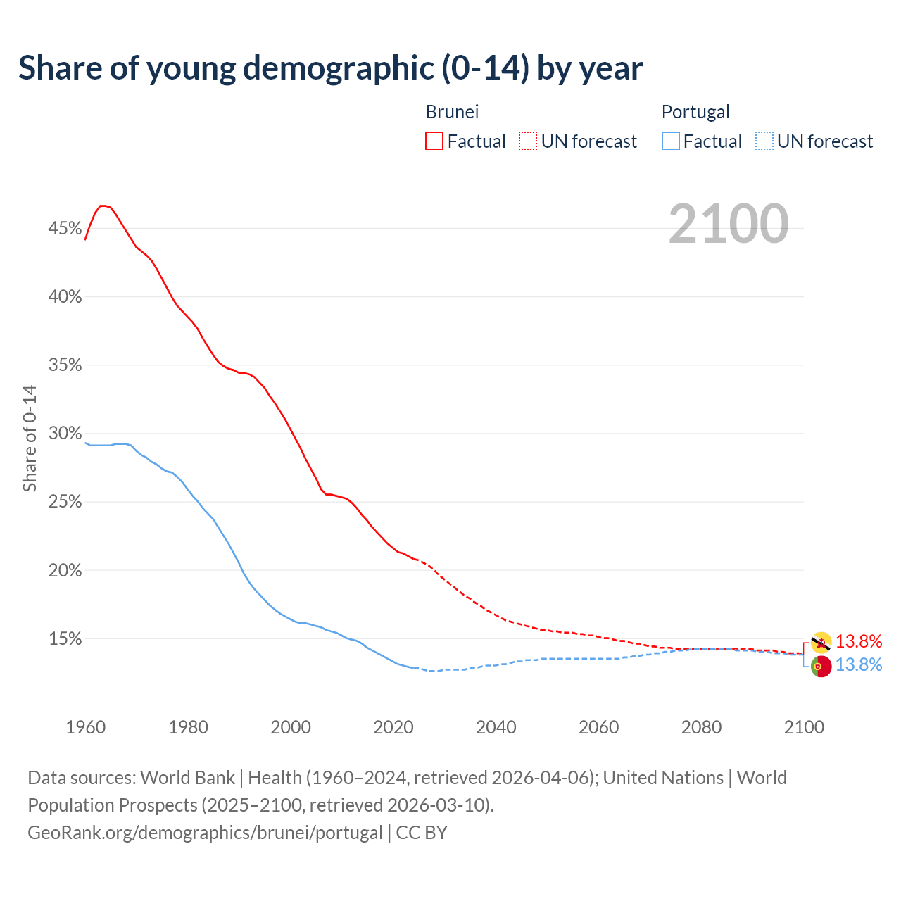 - The share of young demographic (0-15 years old) in Brunei is 20.8% vs 12.8% in Portugal.