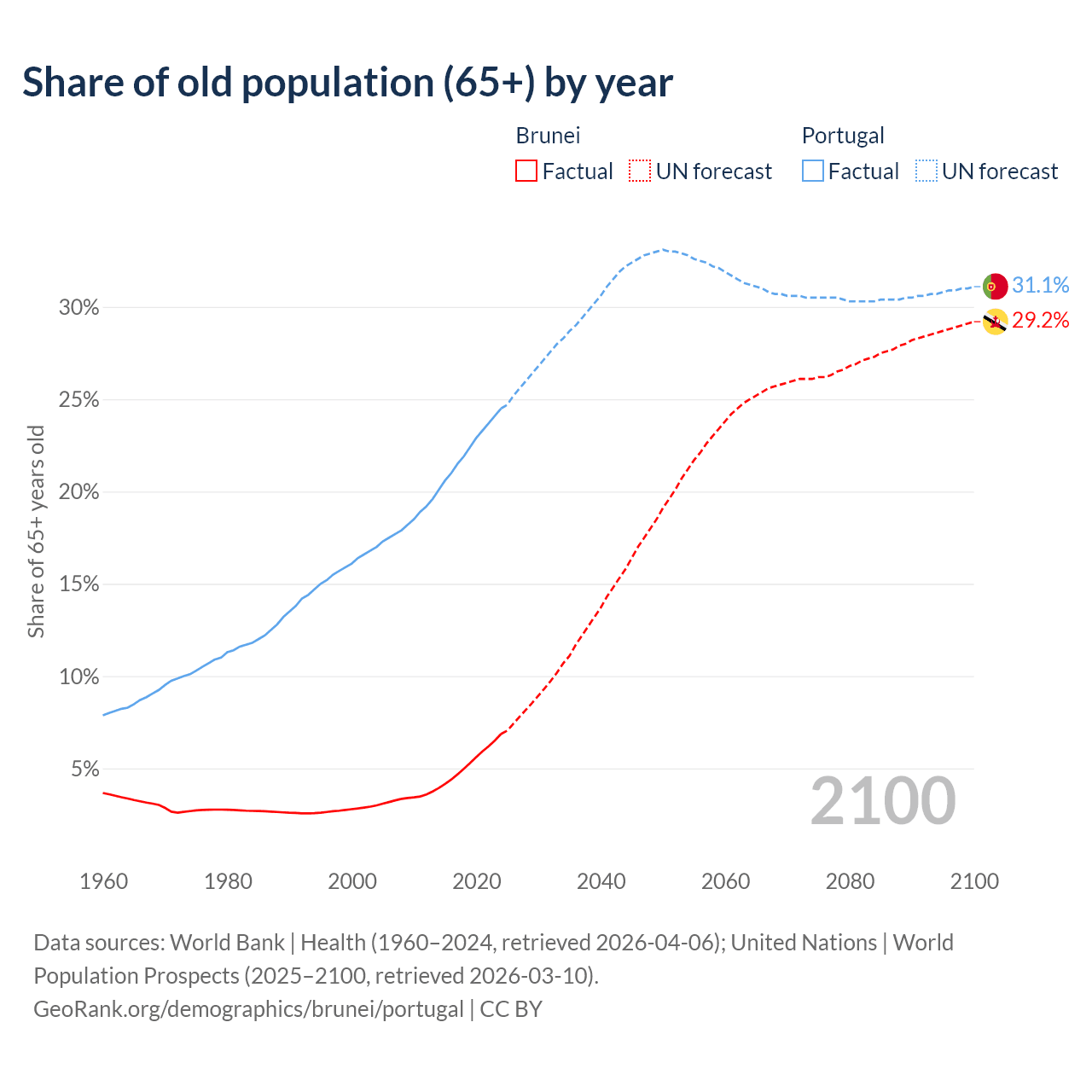 The share of older people aged 65 and over is 6.87% in Brunei and 24.5% in Portugal. Life expectancy in Brunei compared to Portugal .
