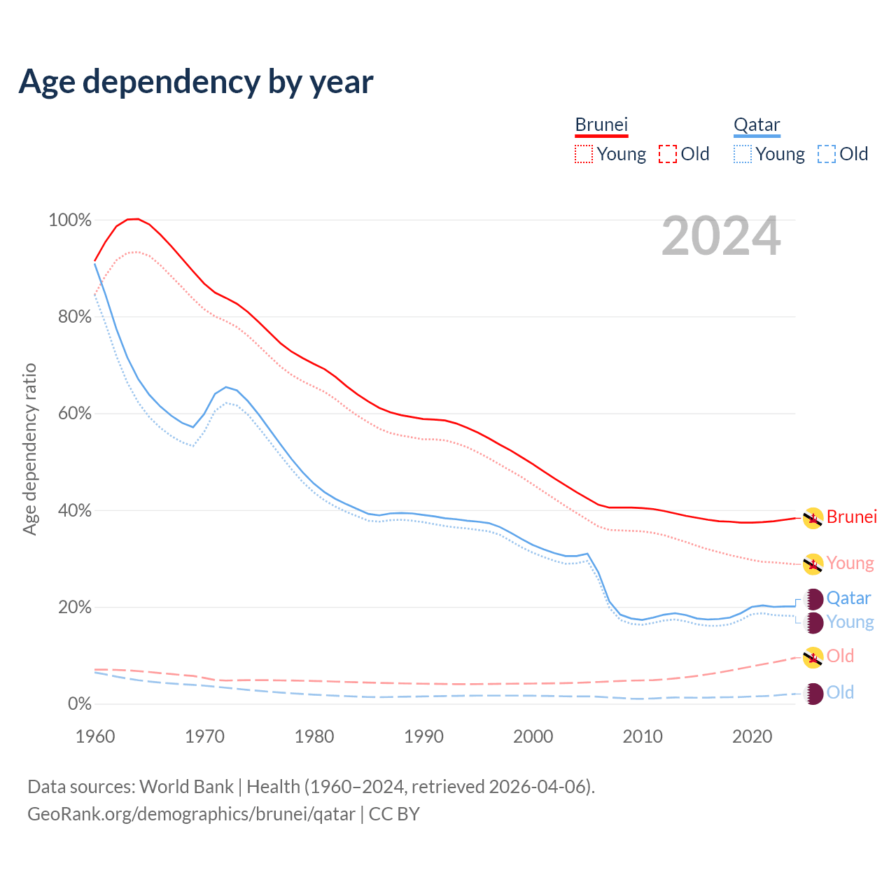 - Brunei is ranked 88/196 by median age (oldest to youngest) vs 78/196 for Qatar.