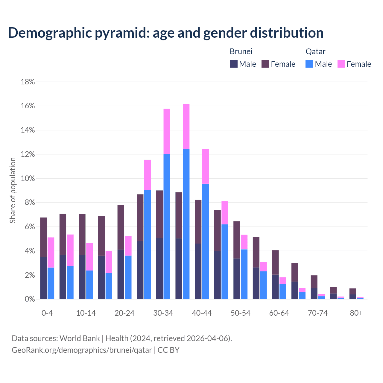- The median age in Brunei is 33.2 years compared to 34.5 years in Qatar.