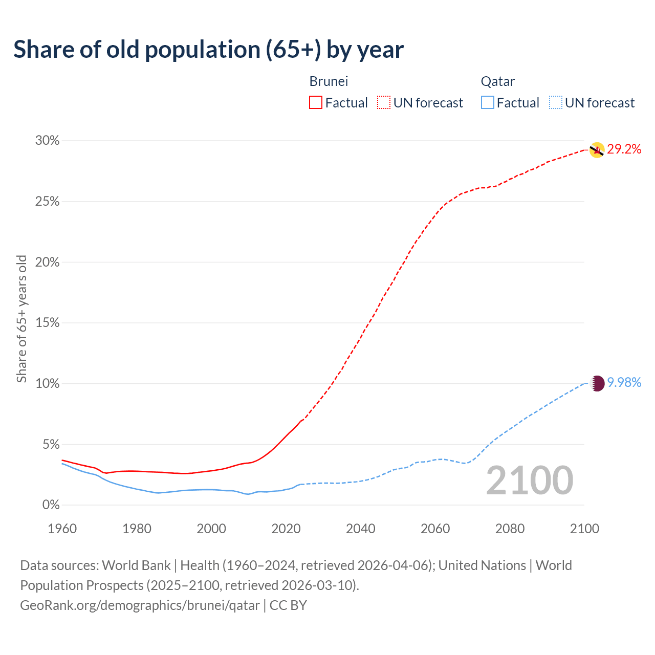 - The share of old-age demographic (65+) in Brunei is 6.87% vs 1.68% in Qatar.