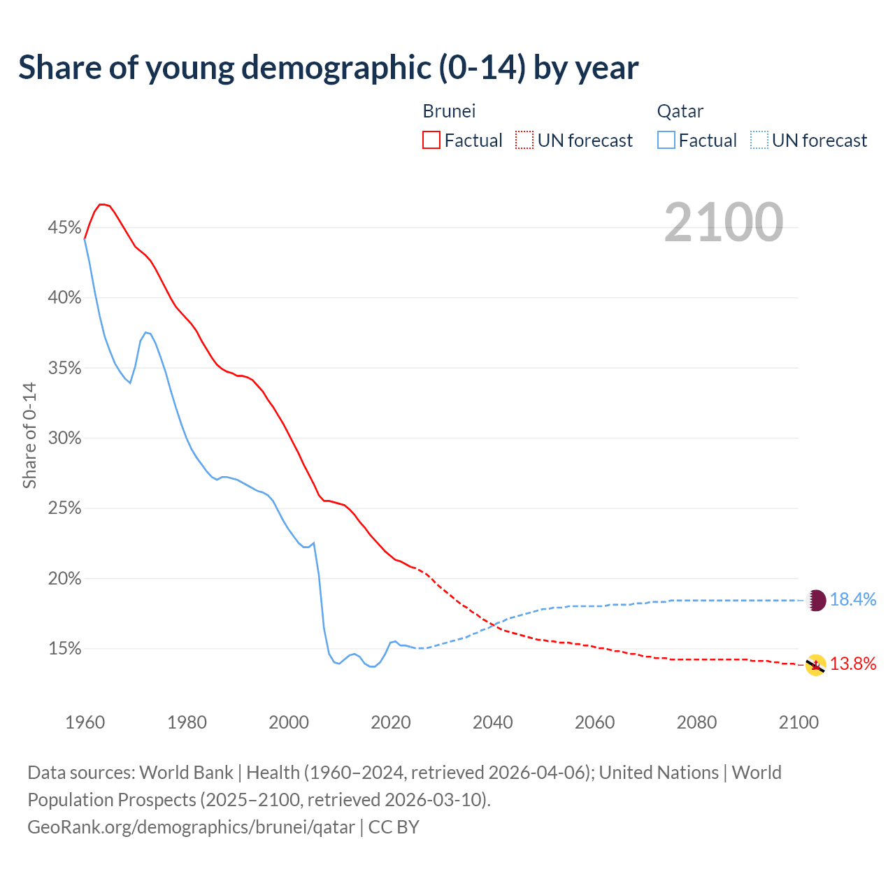 - The share of young demographic (0-15 years old) in Brunei is 20.8% vs 15.1% in Qatar.