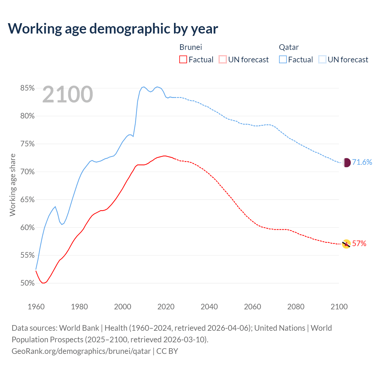 - Brunei has 340K working age adults (aged 15-64) vs 2.5M in Qatar.