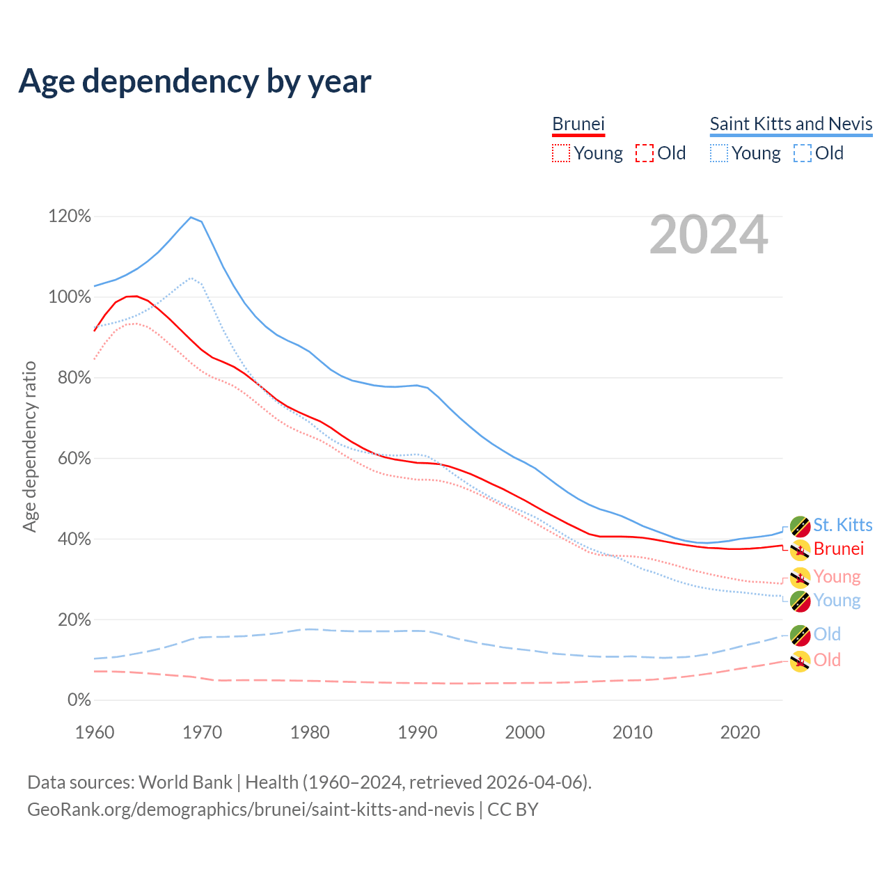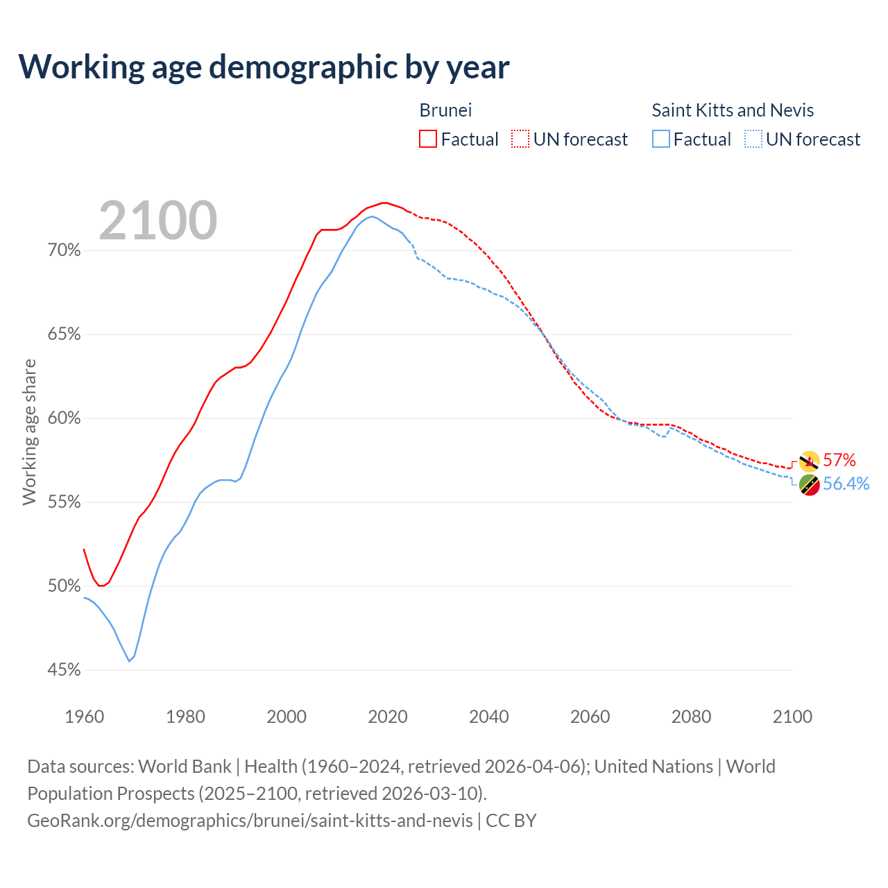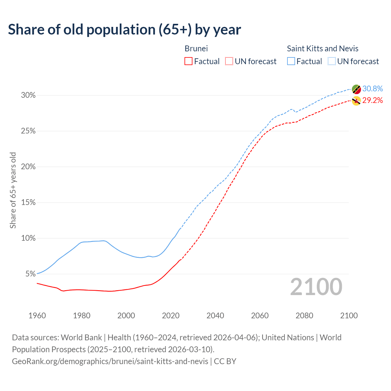 The share of older people aged 65 and over is 6.87% in Brunei and 11.2% in Saint Kitts and Nevis. Life expectancy in Brunei compared to Saint Kitts and Nevis .