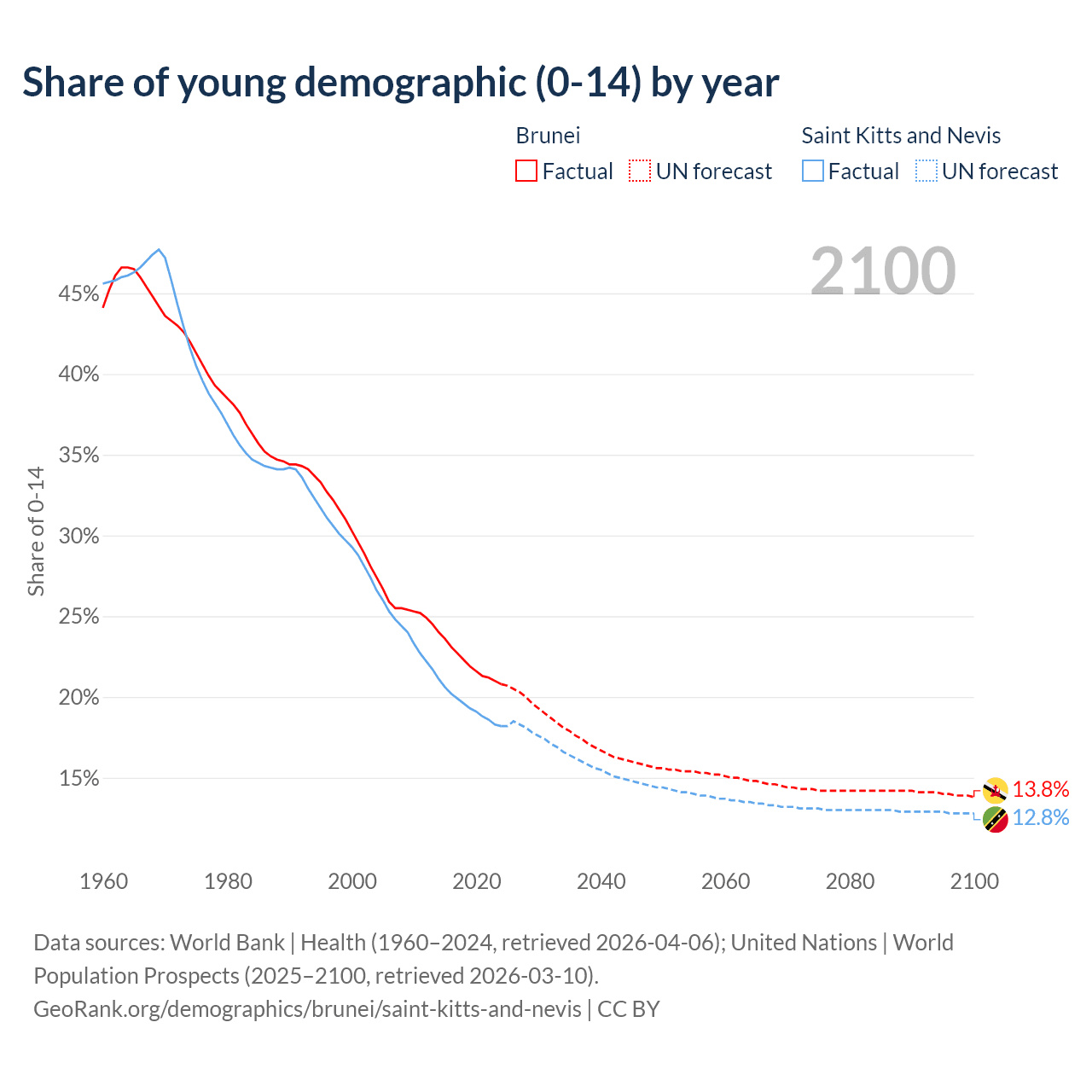 - The share of young demographic (0-15 years old) in Brunei is 20.8% vs 18.2% in Saint Kitts and Nevis.