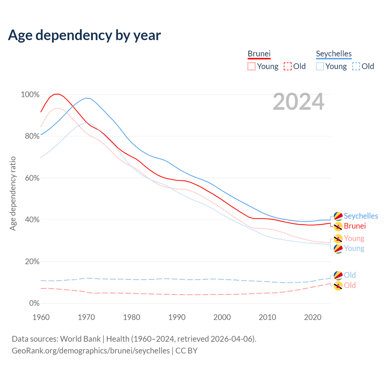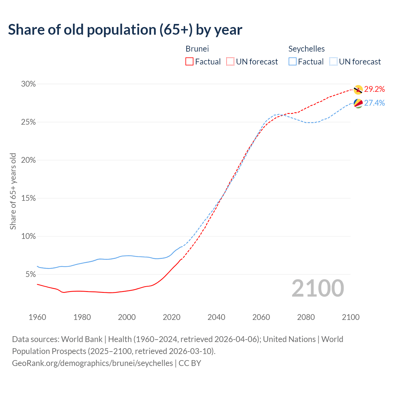 - The share of old-age demographic (65+) in Brunei is 6.87% vs 8.54% in the Seychelles.