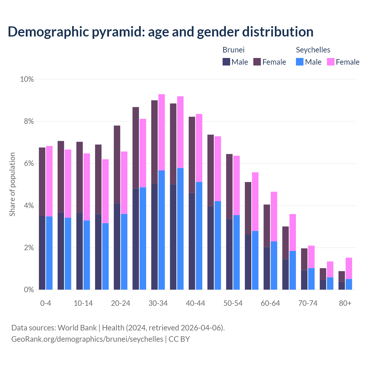 - As of 2026, the population of Brunei is 471K vs 126K in the Seychelles - 3.73 times difference.