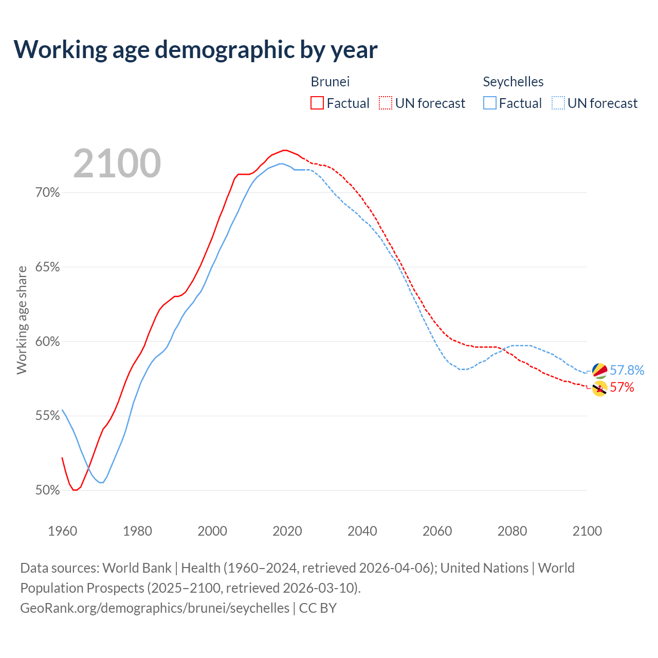 - Brunei has 340K working age adults (aged 15-64) vs 90.3K in the Seychelles.