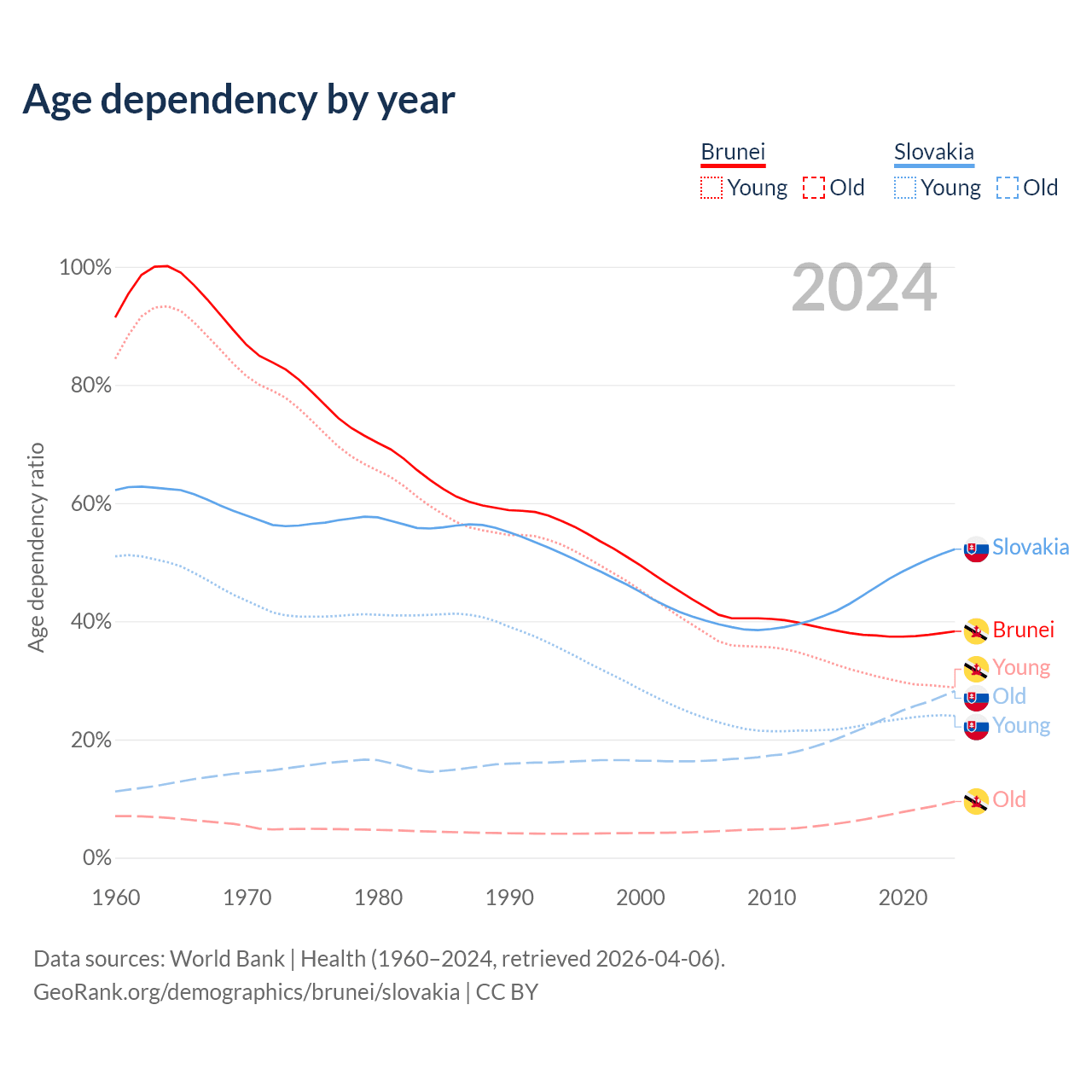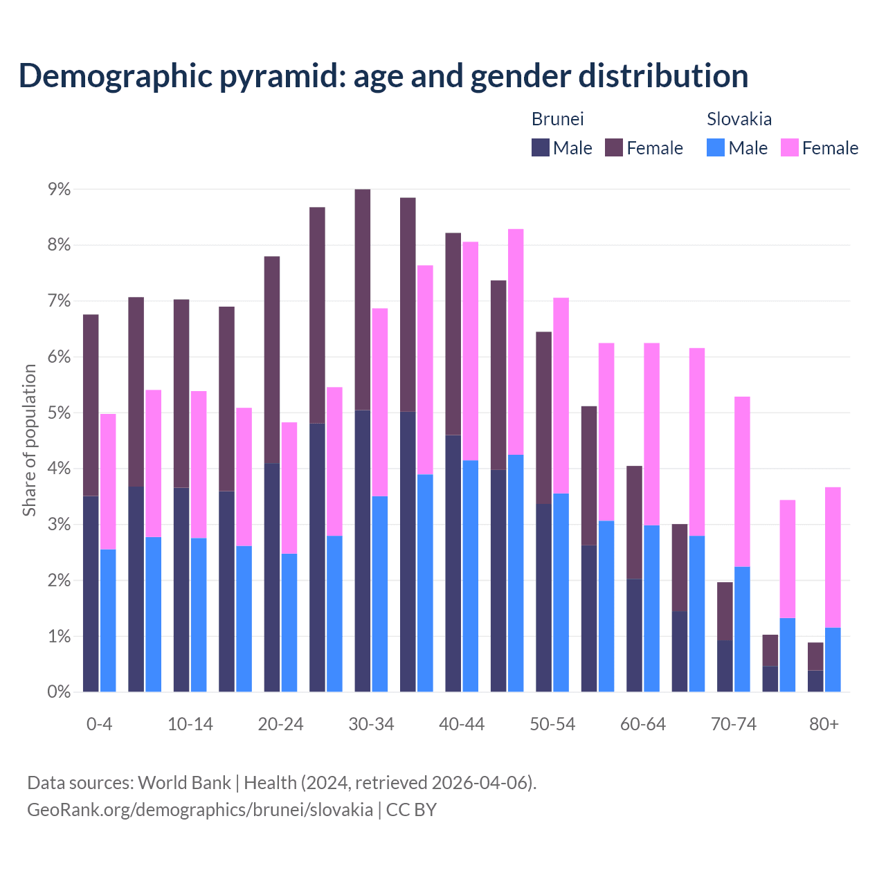 - Brunei is ranked 88/196 by median age (oldest to youngest) vs 31/196 for Slovakia.