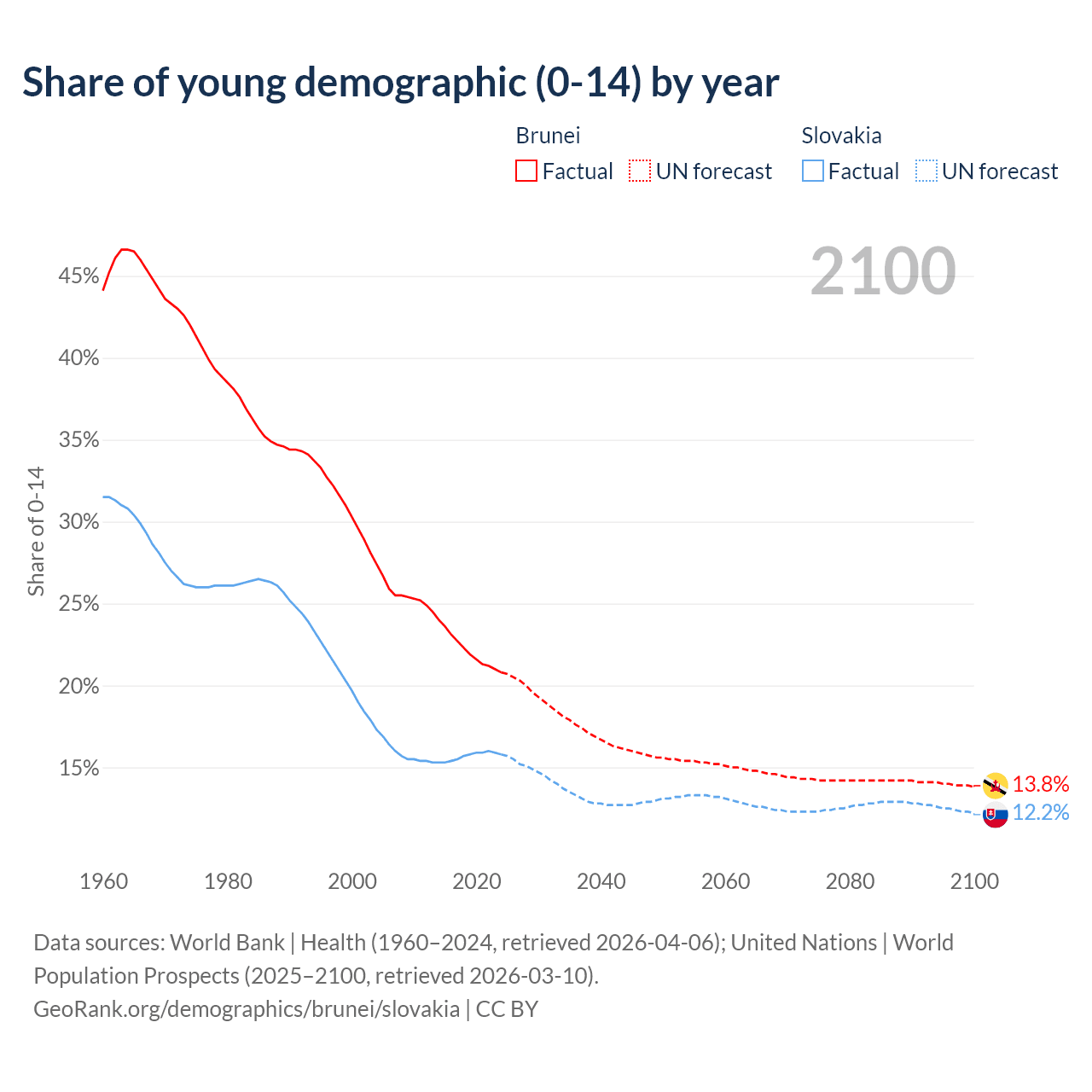 - The share of young demographic (0-15 years old) in Brunei is 20.8% vs 15.8% in Slovakia.