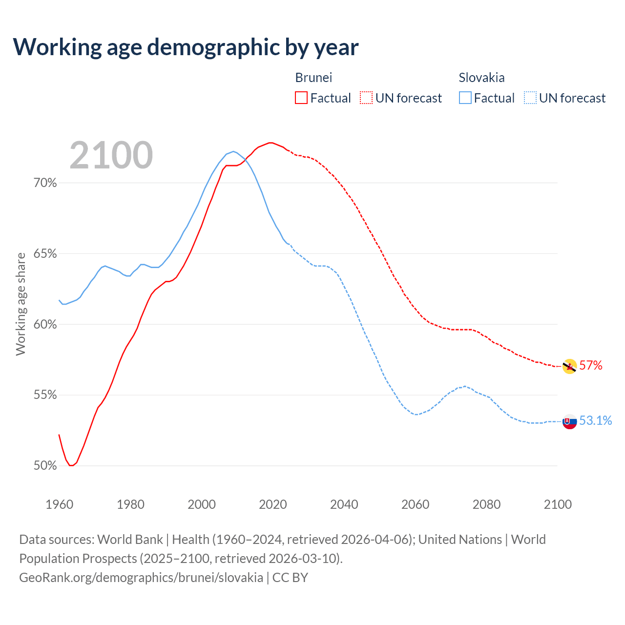 Median age Brunei vs Slovakia, 1960-2100