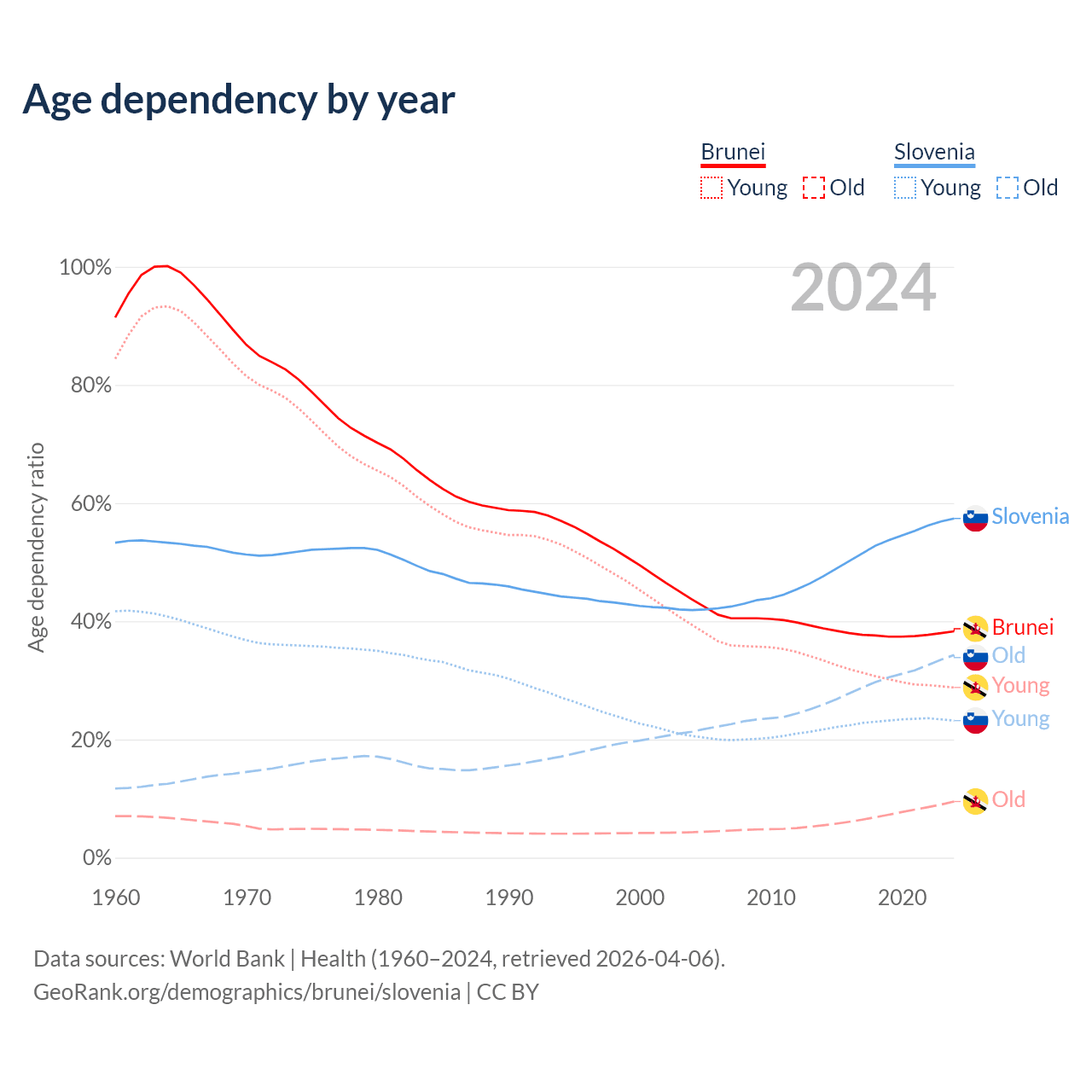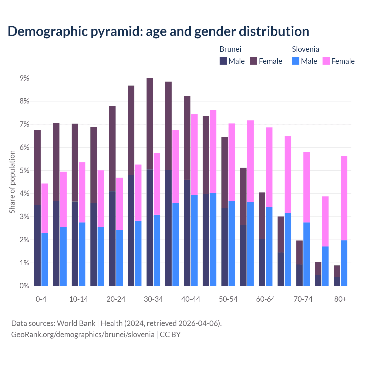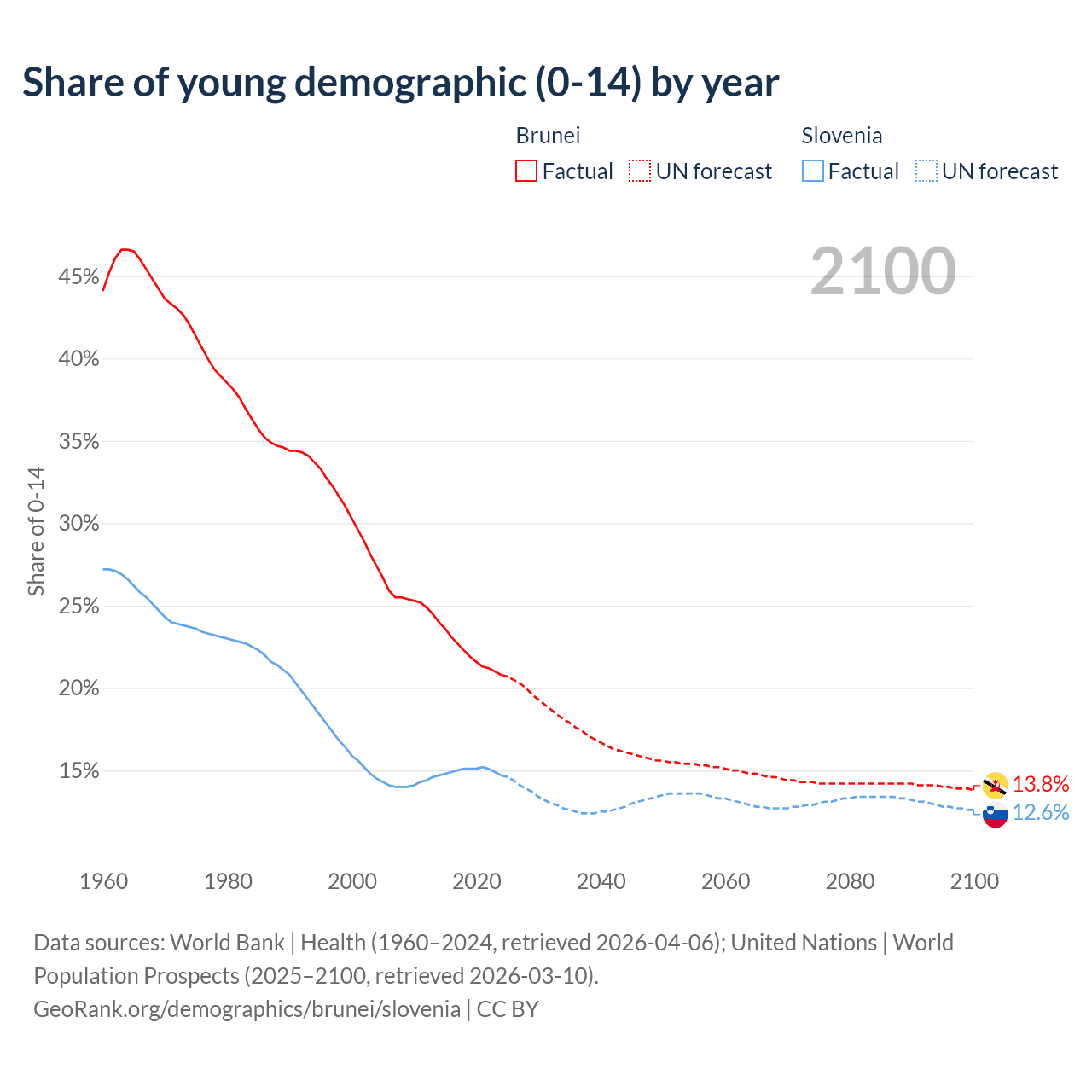- The share of young demographic (0-15 years old) in Brunei is 20.8% vs 14.7% in Slovenia.