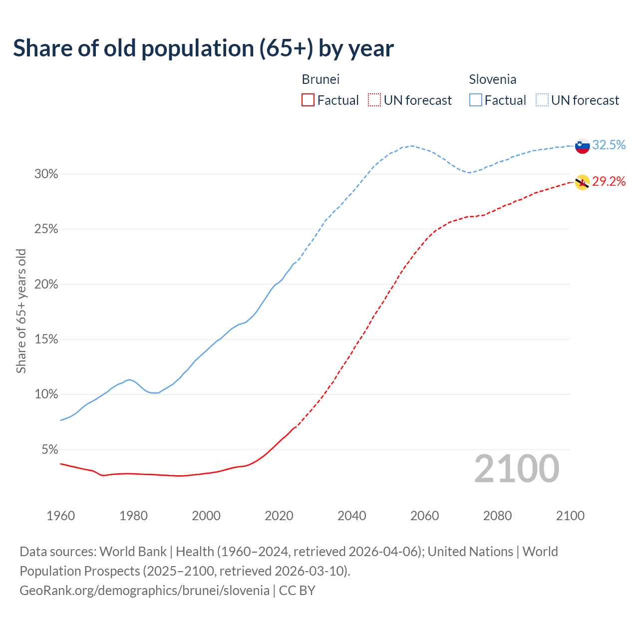 The share of older people aged 65 and over is 6.87% in Brunei and 21.8% in Slovenia. Life expectancy in Brunei compared to Slovenia .