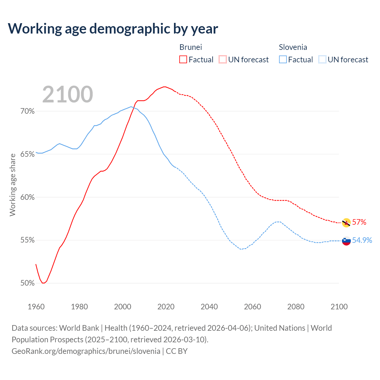 Median age Brunei vs Slovenia, 1960-2100